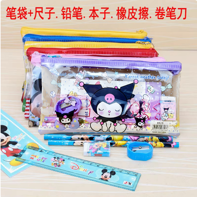 售价为一套套装的价格,包含笔袋1个 铅笔2支 卷笔刀1个 尺子1支 橡皮1块 贴纸1本(或者是一本本子)