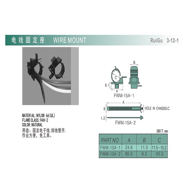 3. 电线固定系列产品:包括电线固定座、电线固定扣、排线固定板、隔离束线座、电源线扣、护线环、束线带等。