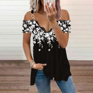 2022夏新欧美wisheBay女短袖露肩花朵印花蕾丝拼接一字领上衣T恤