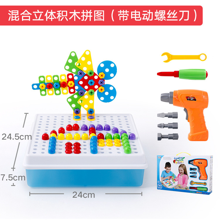 어린이 전기 드릴 너트 분해 및 조립 페어링 조합 3 차원 직소 퍼즐 도구 테이블 실습 나사 교육 완구스토어 가기