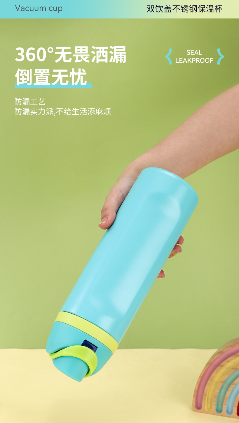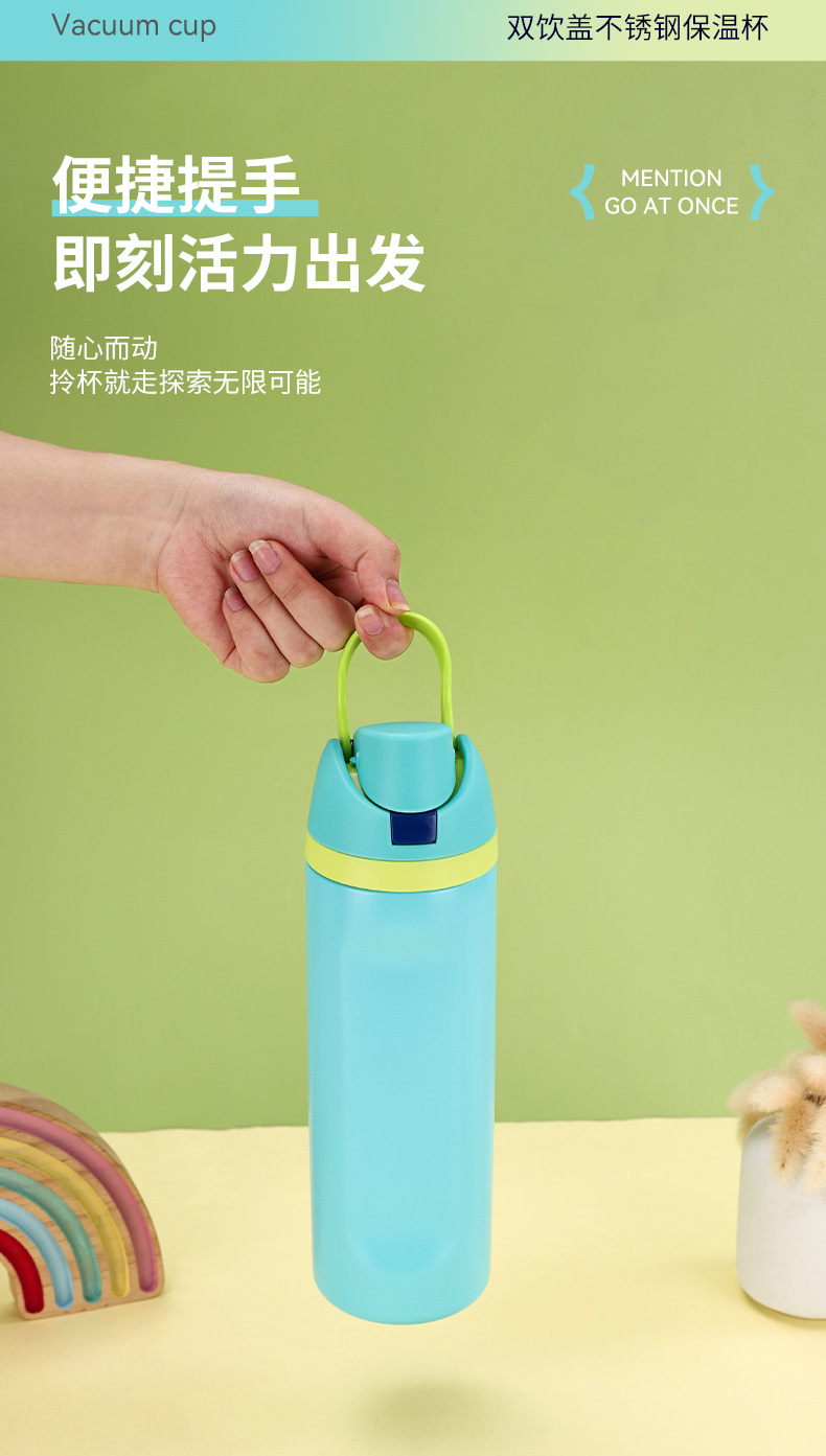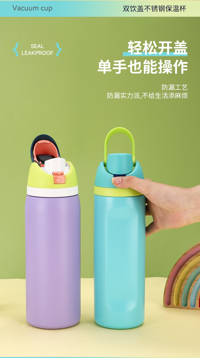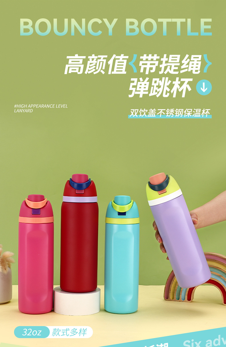 크로스보더 이중 뚜껑 스테인리스 보온병 남녀 야외 스포츠 과일컵 고급스러운 디자인 끈이 달린 점프컵스토어 가기