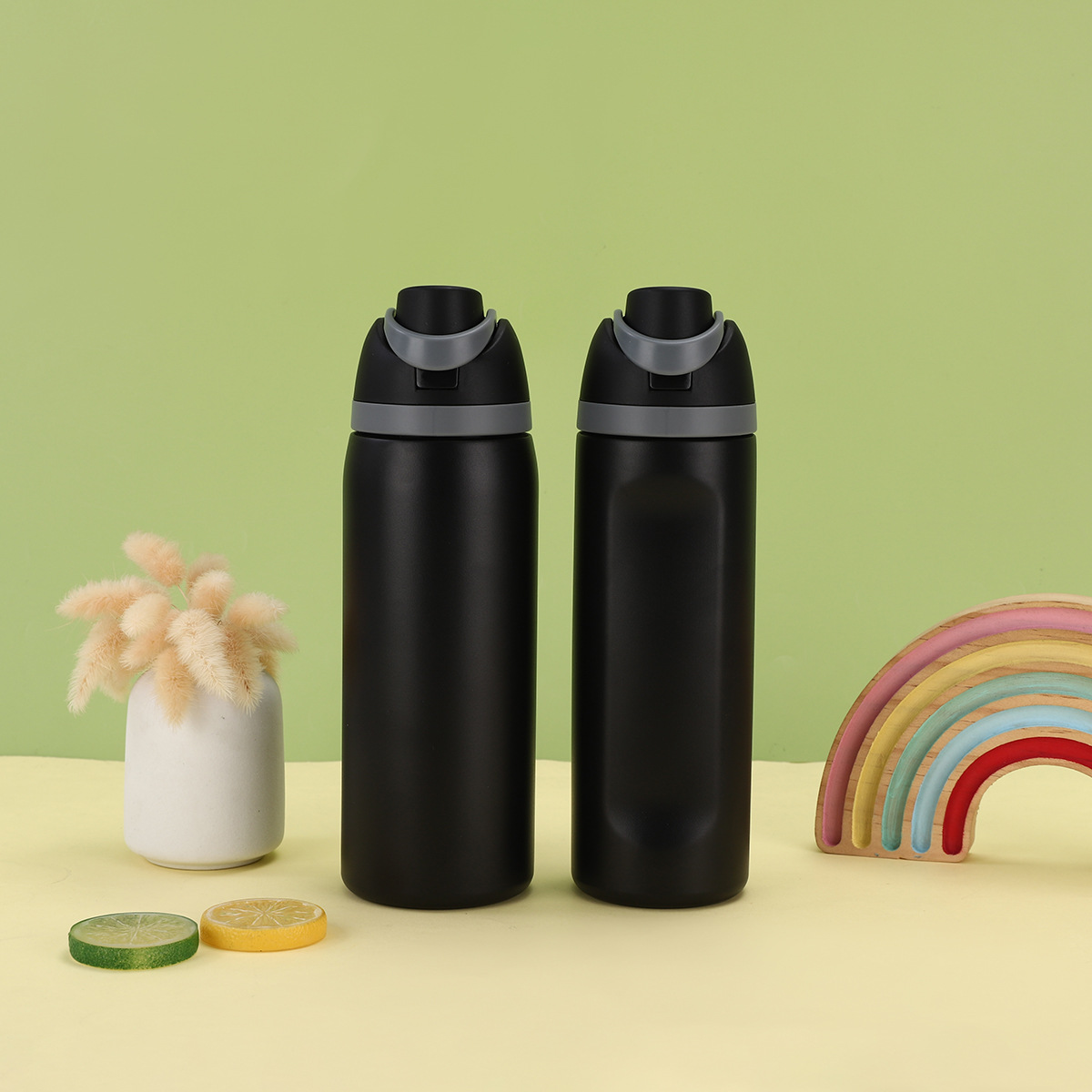 크로스보더 이중 뚜껑 스테인리스 보온병 남녀 야외 스포츠 과일컵 고급스러운 디자인 끈이 달린 점프컵