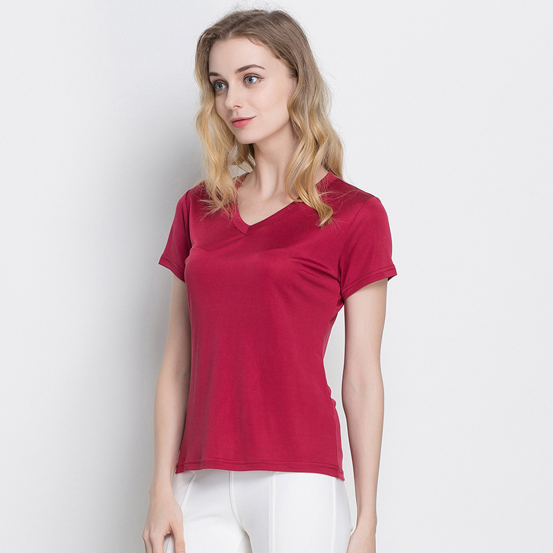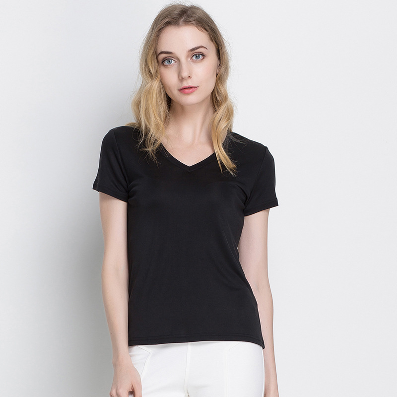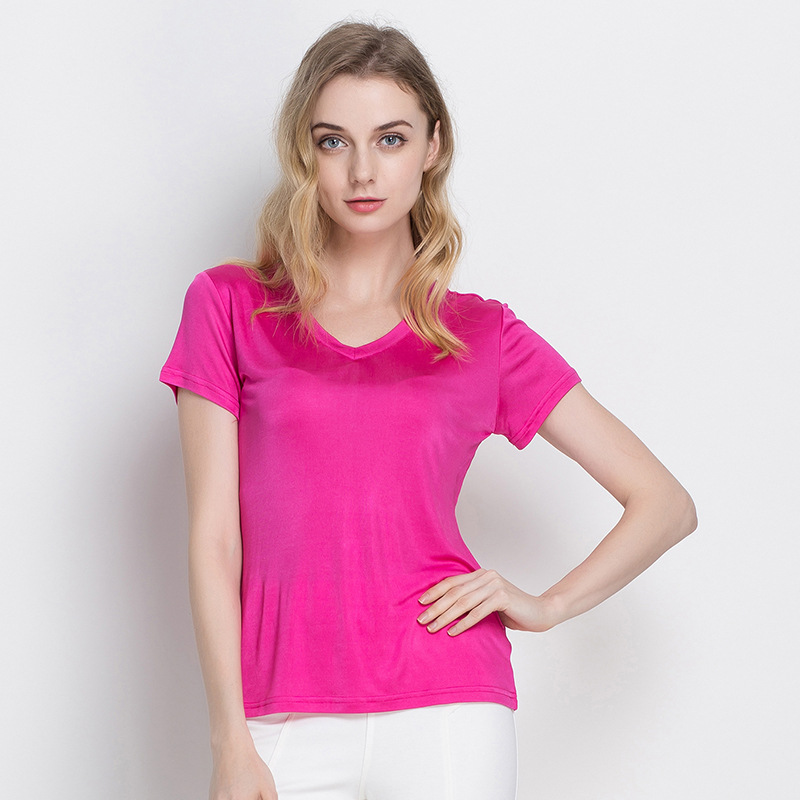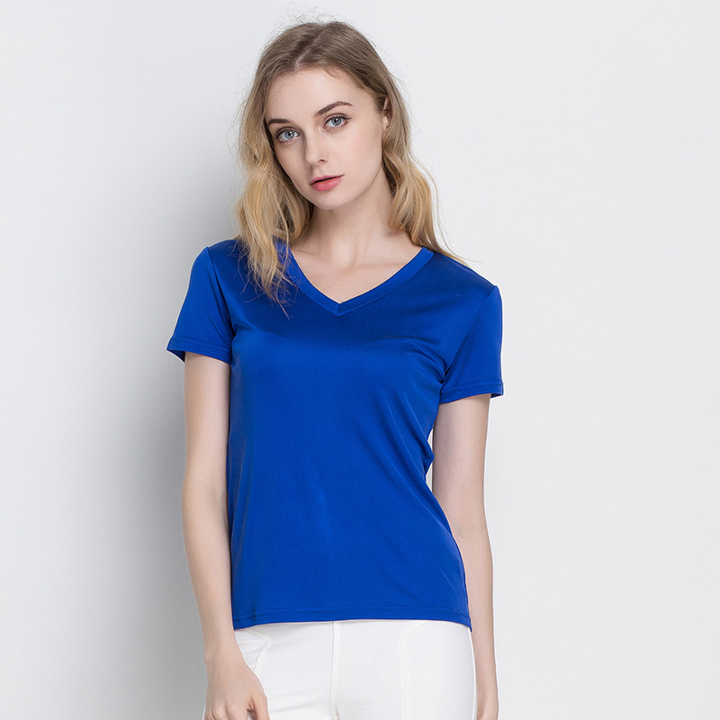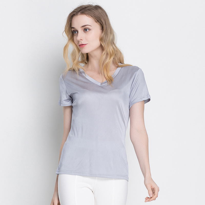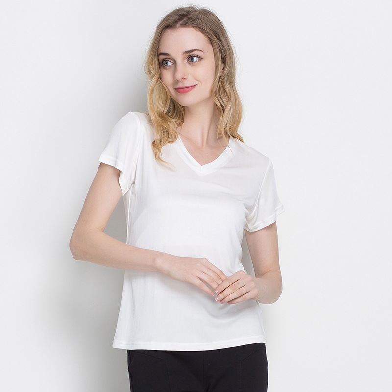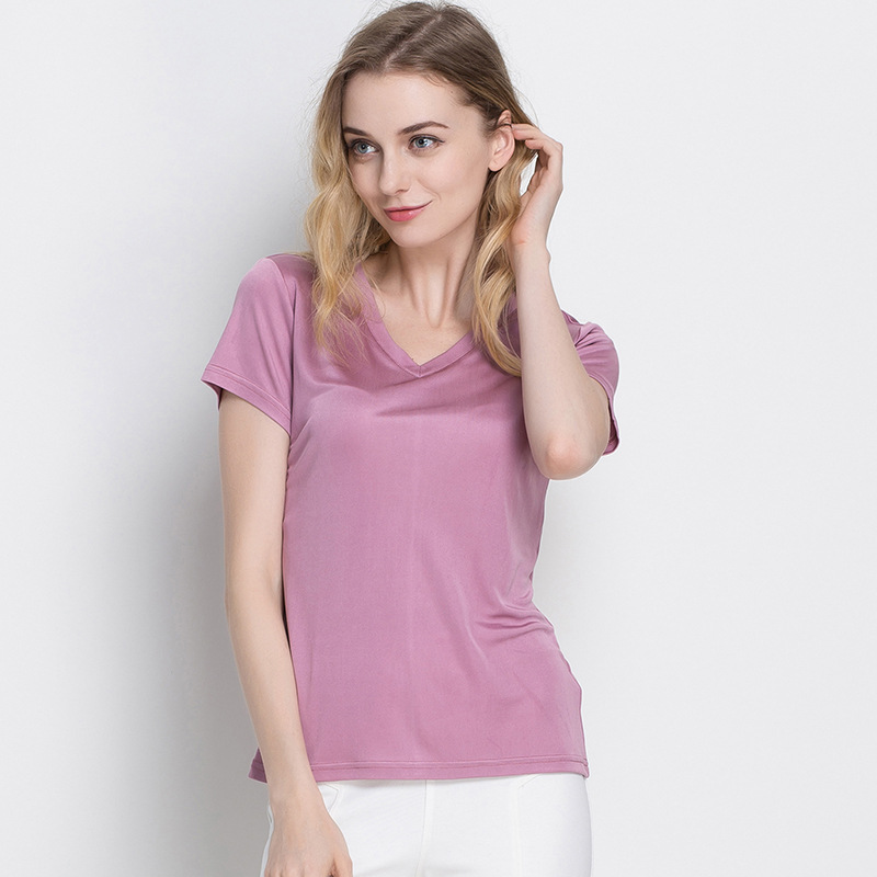 여름 뽕나무 실크 여성용 V-넥 반팔 티셔츠 양면 니트 실크 슬림핏 솔리드 컬러 베이스 셔츠 여성 탑스토어 가기