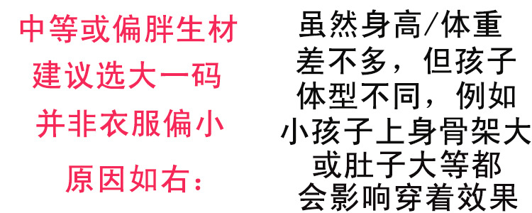 衣服按身高下单,偏胖的小朋友下单时候还请注意需要加大一码哦!如有不确定请联系我们,你的一次点击,给我们一个合作的机会!