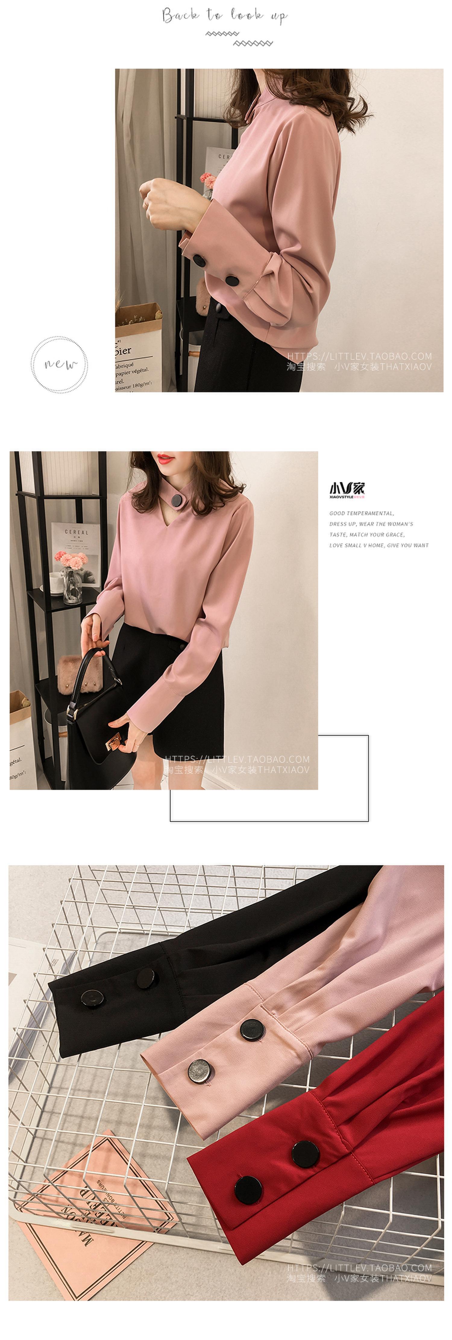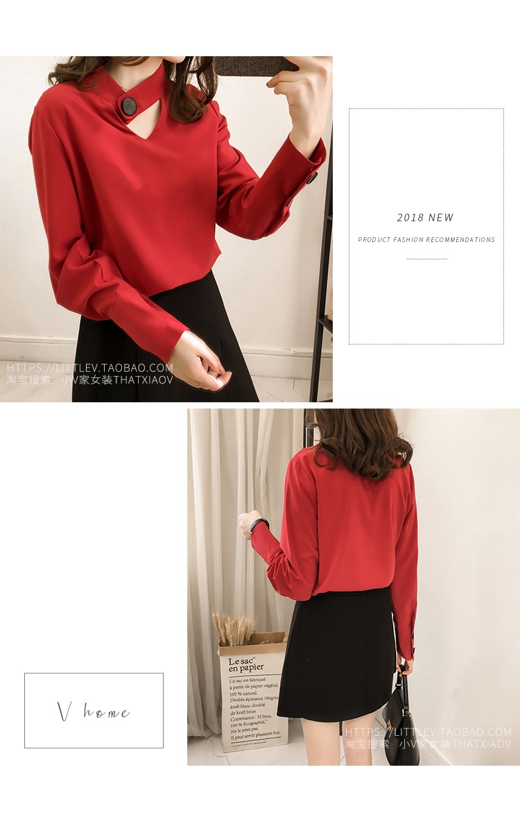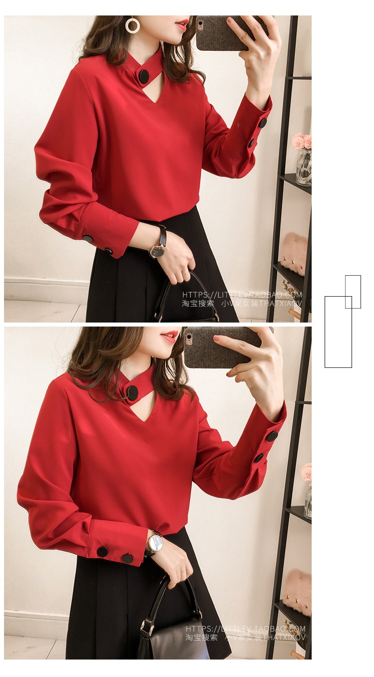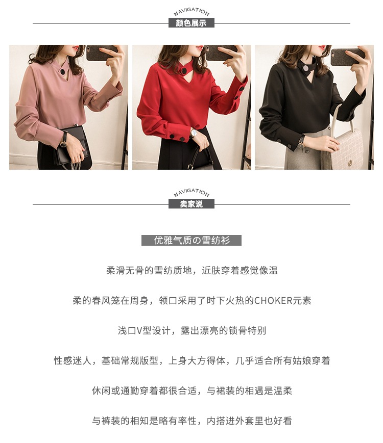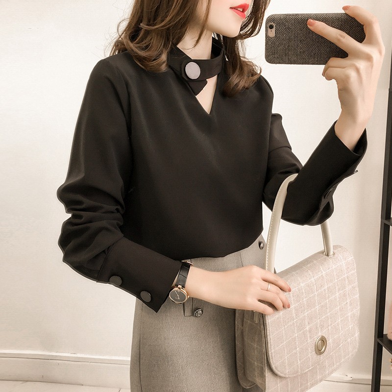 2023 한국 스타일 봄 신상품 유행 중공 목 쉬폰 셔츠 여성용 달콤한 단색 슬리밍 긴 소매 기본 셔츠스토어 가기