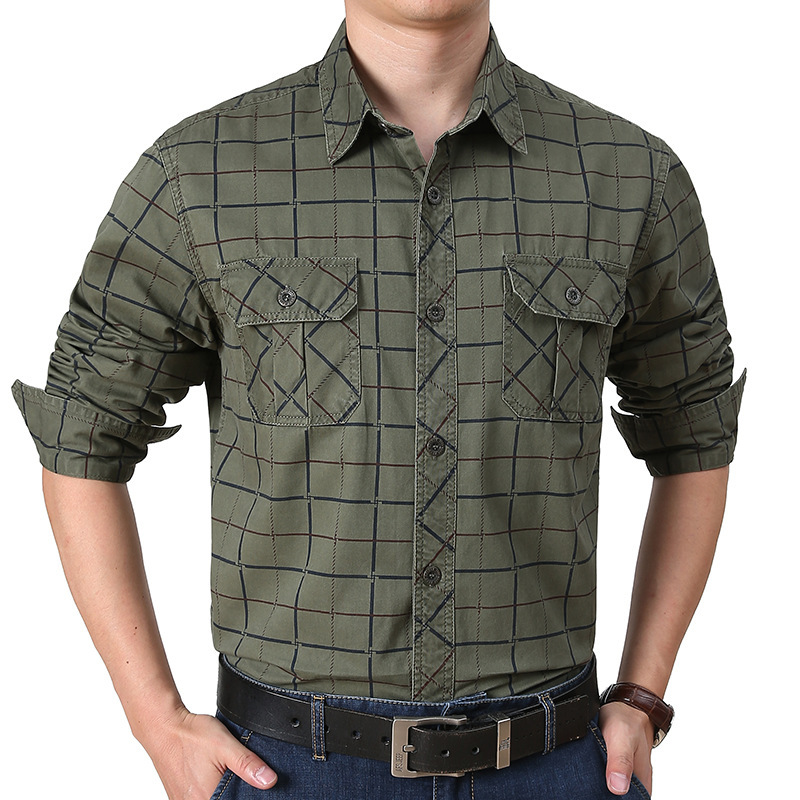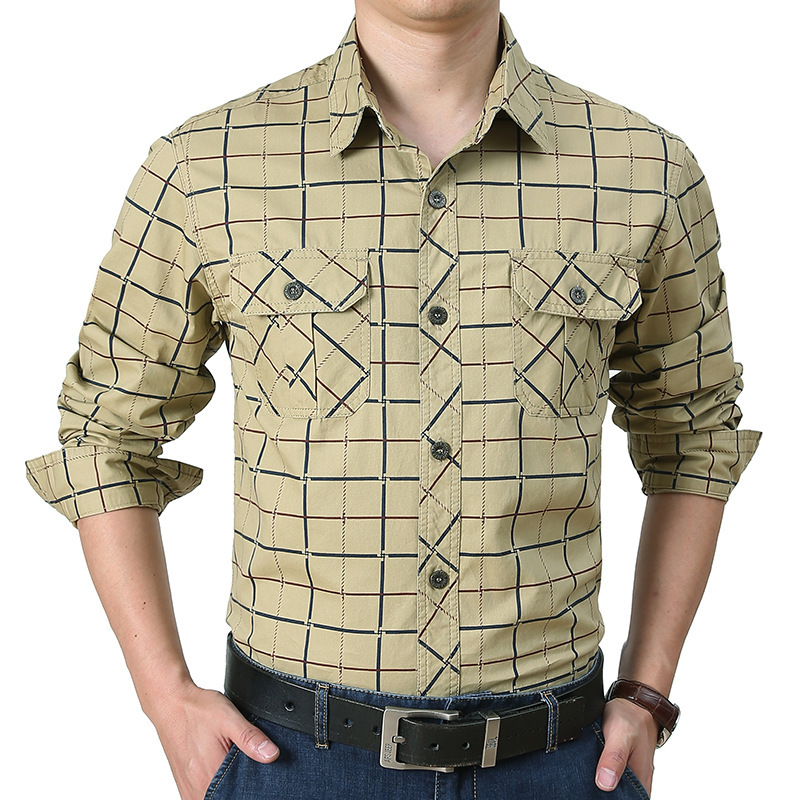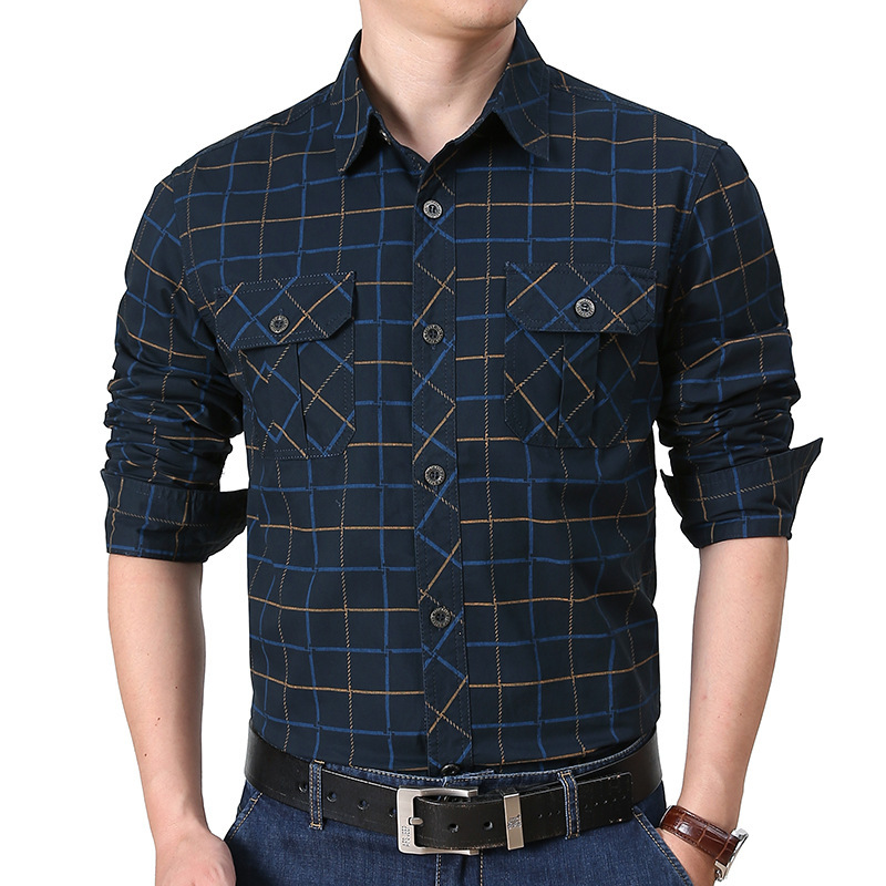 봄과 가을 새로운 도착 남성 격자 무늬 긴 소매 셔츠 턴 다운 칼라 멀티 포켓 코튼 플러스 사이즈 비즈니스 캐주얼 셔츠 R006스토어 가기