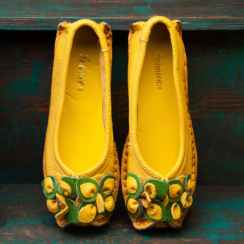 에스닉 스타일 소가죽 여성 신발 부드러운 밑창 낮은 뱀프 플랫 힐 신발 편안한 엄마 신발 꽃 싱글 레이어 신발 라운드 토 미드 힐 신발
