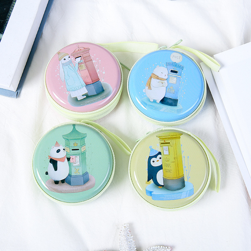 새로운 만화 동물 모양의 틴케이스 동전 지갑, 동전 보관함, 어린이용 수납함, 원형 휴대용 이어폰 가방