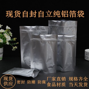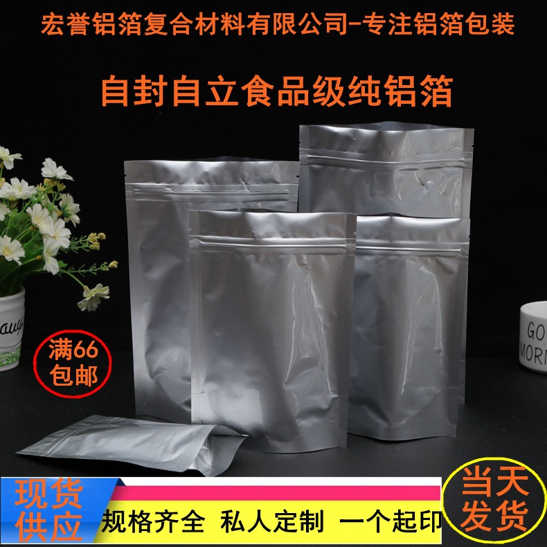 自封自立纯铝箔袋 铝箔袋又叫纯铝袋,具有金属光泽,对热和光具有较高的反射能力,印刷色彩精美明亮!隔绝性能好,保护性能强,不透气体和水气,有效防止内装物吸潮及气化,不易受细菌和昆虫的侵害;形状稳定性好,不受湿度变化影响! (1)阻隔空气性能强、防氧化、防水、防潮。
