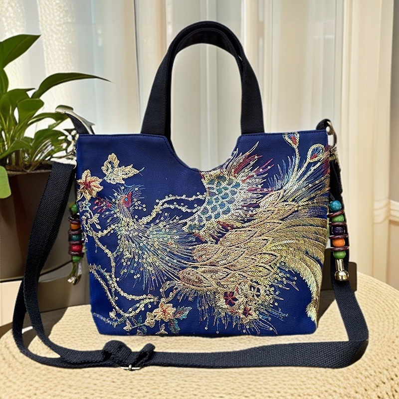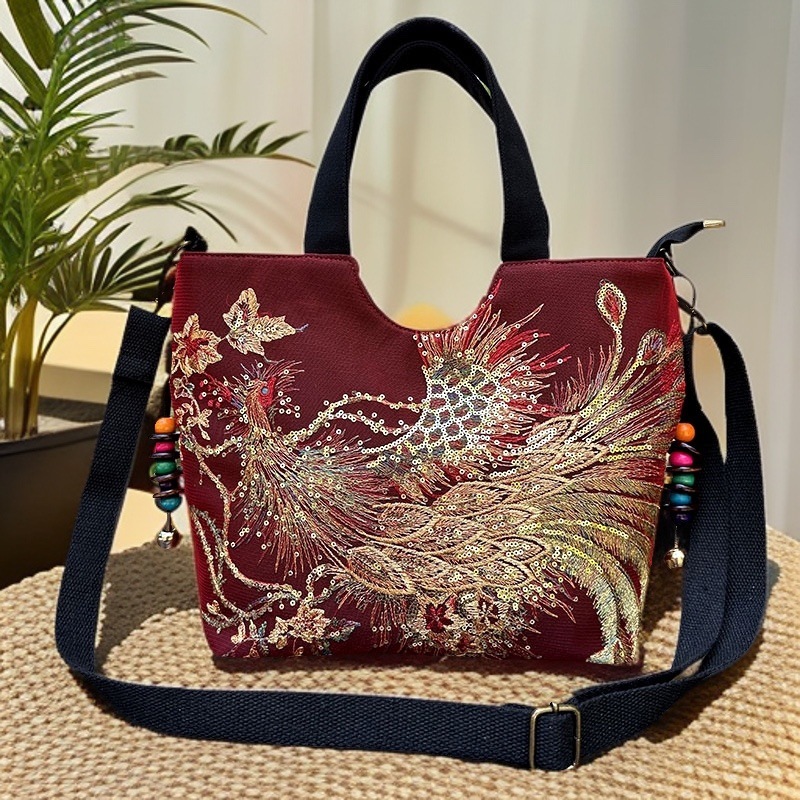 새로운 윈난 민족 스타일 자수 캔버스 가방 스팽글 피닉스 자수 여성 휴대용 숄더백 메신저 가방 도매