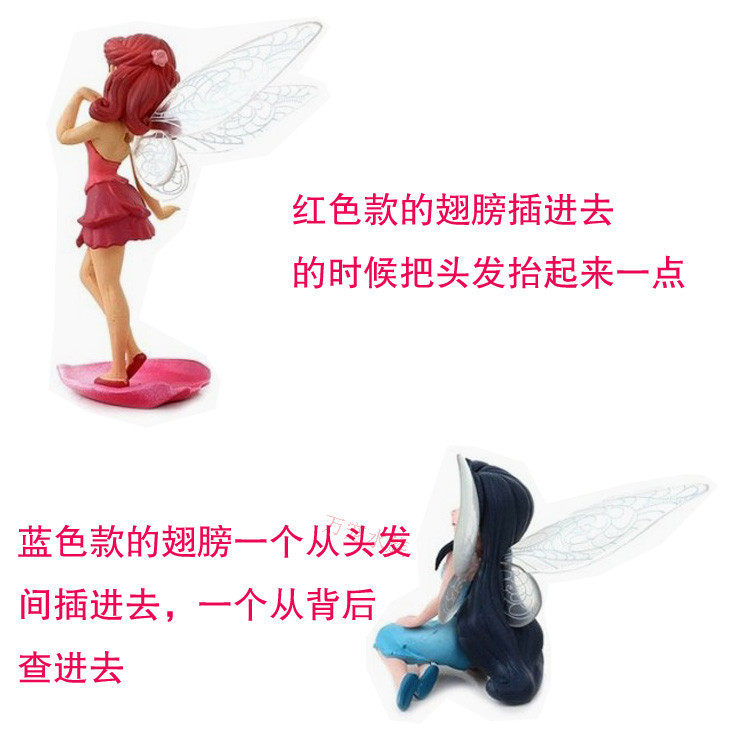 蓝衣仙子翅膀为拆开设计,分为2个小翅膀,绝对不是翅膀断开,有突口的翅膀安装在左后背插在小孔里,底部平滑的翅膀安装在右头发中间的缝里。