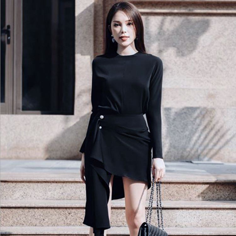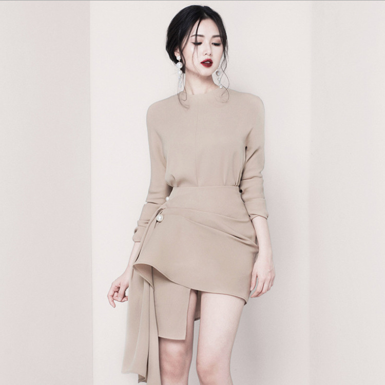 여성 의류 소스 제조 업체 가을과 겨울 패션 새로운 세트 사교계 기질 라운드 넥 허리 불규칙 스커트 투피스 세트스토어 가기