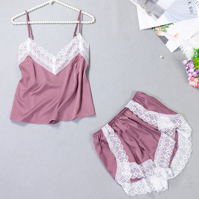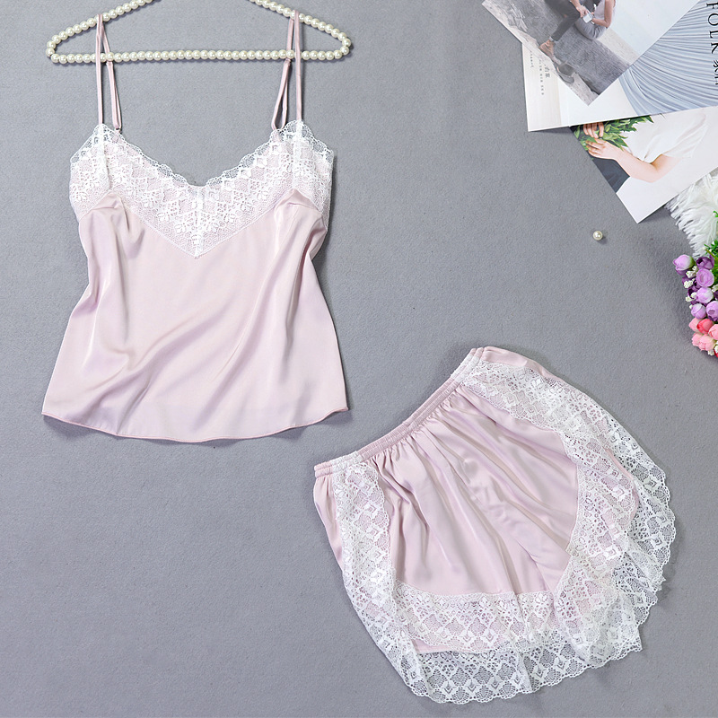 새로운 얼음 실크 모조 실크 잠옷 여자의 섹시한 레이스 조끼 반바지 2 피스 실크 잠옷 세트 대외 무역스토어 가기
