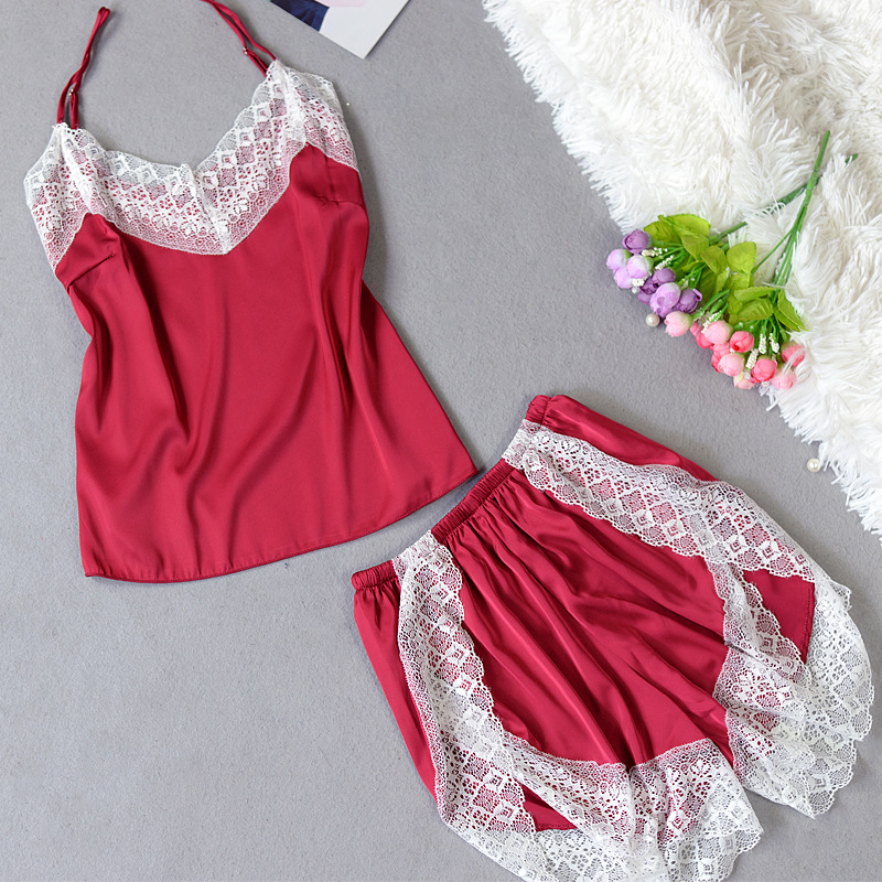 새로운 얼음 실크 모조 실크 잠옷 여자의 섹시한 레이스 조끼 반바지 2 피스 실크 잠옷 세트 대외 무역