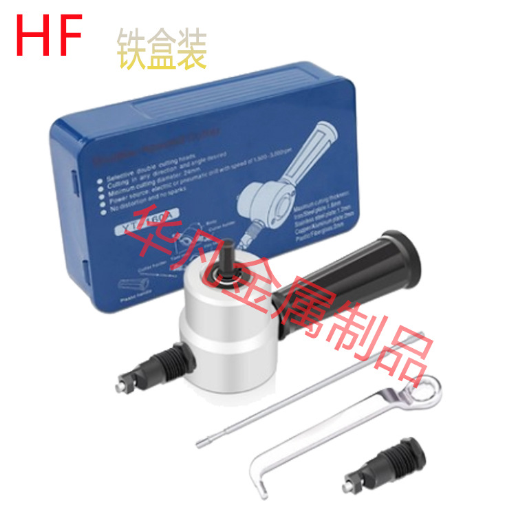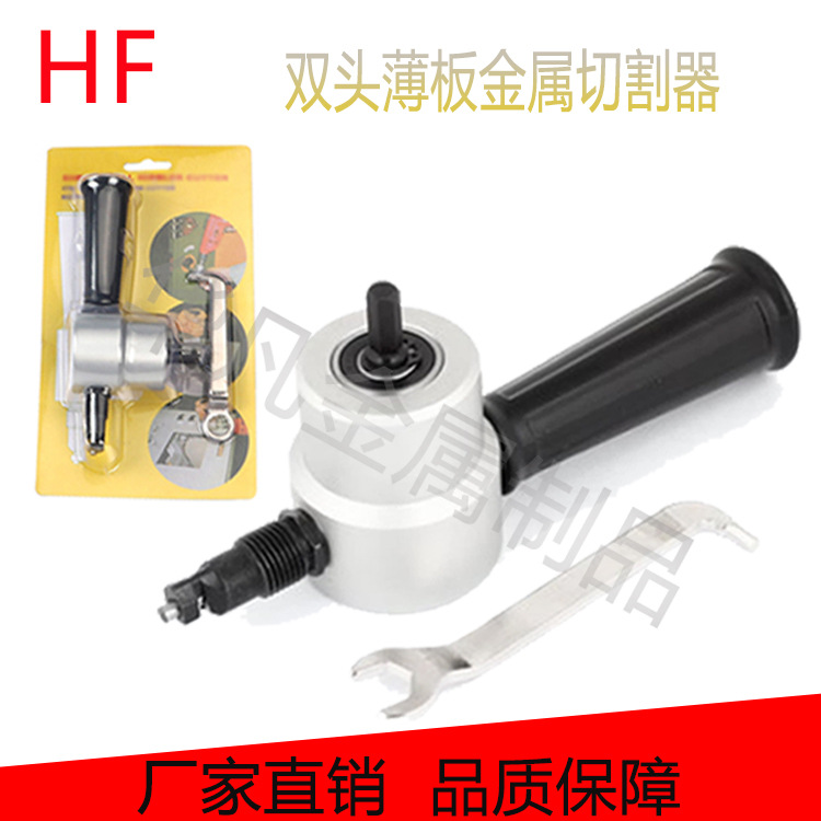 This dual head air metal nibbler cutter is to be used with an electric drill or