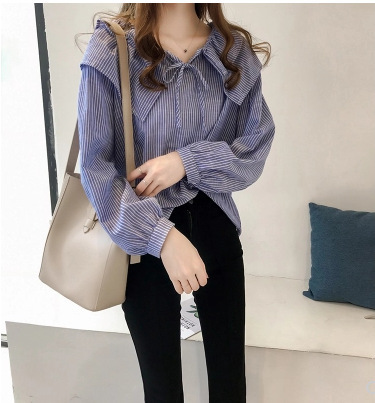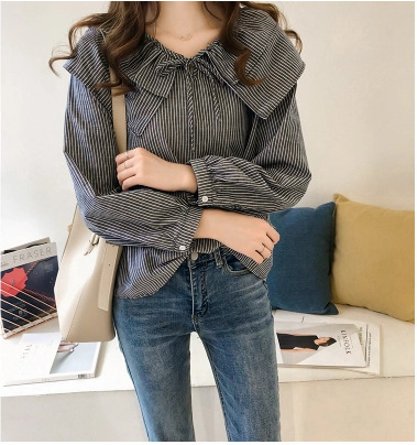 여자의 새로운 2023 한국 스타일 인형 칼라 스트라이프 셔츠 여자의 느슨한 플러스 사이즈 세련된 탑 홍콩 스타일 긴 소매 셔츠스토어 가기