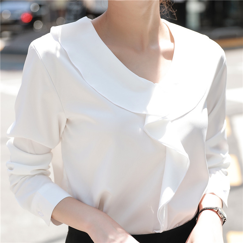 새로운 여성 셔츠 프릴 V-넥 긴 소매 셔츠 흰색 느슨한 쉬폰 셔츠 공장 직접 도매스토어 가기
