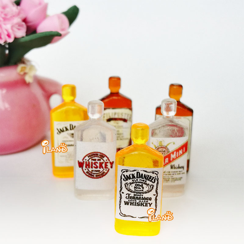 6瓶各种颜色品牌的威士忌和烈酒,口袋型小瓶装,给娃娃屋场景增添浓烈生活气息哦~不包括其它装饰。