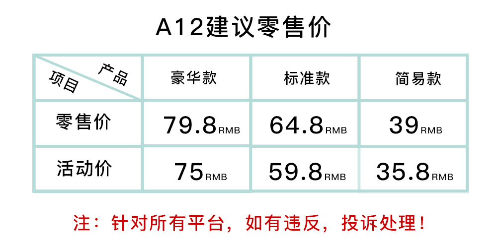 A12:(产品材质:PC+ABS+PP 产品包装:精美彩盒包装 包装尺寸:21.5*7.5*7cm 产品尺寸:70*60*205mm 标准套装:420g/个 13.5kg/箱 装箱数:30/箱 箱规:40*36*22.5cm