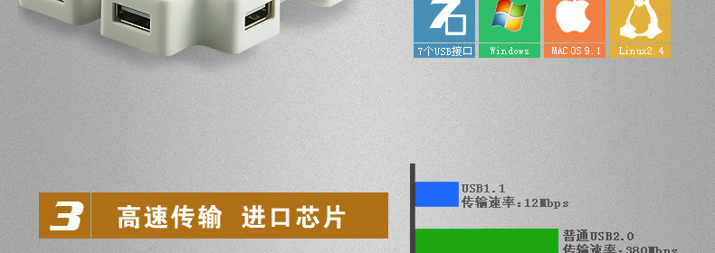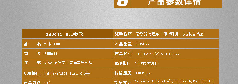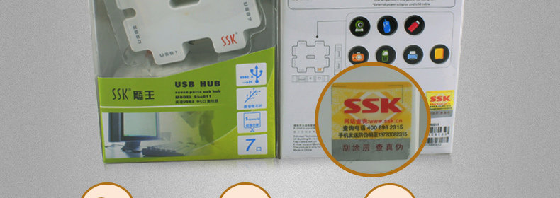 这款SSK具备过流检测和保护,兼容USB1.1和2.0设备,另外USB2.0设备文件传输速率高达480Mbps,驱动程序,即插即用,所有端口支持热插拔,低功耗,发热小,还配备电源适配器和USB连接线,外壳全塑胶ABS材质。