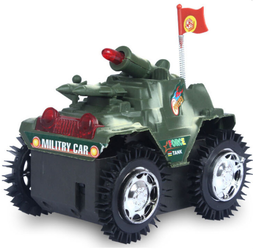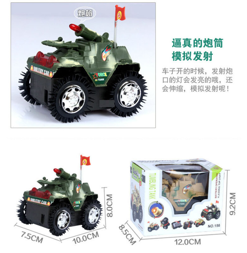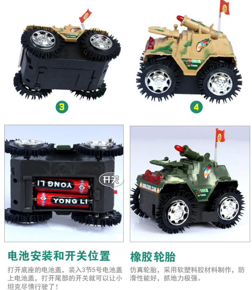 商品描述:很漂亮的一款玩具装甲车哦,操作很简单,只需要2节5号电池,打开后面开关,车子就会跑哦, 精美细致的橡胶轮子设计,让车子翻滚更灵活更流程,更有趣的是它还能自各翻身呢,很特别吧!