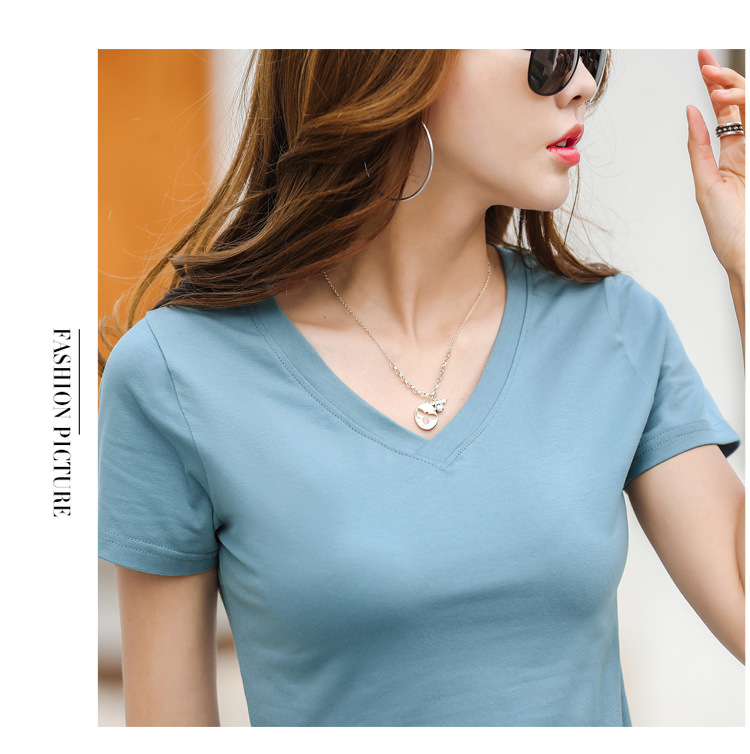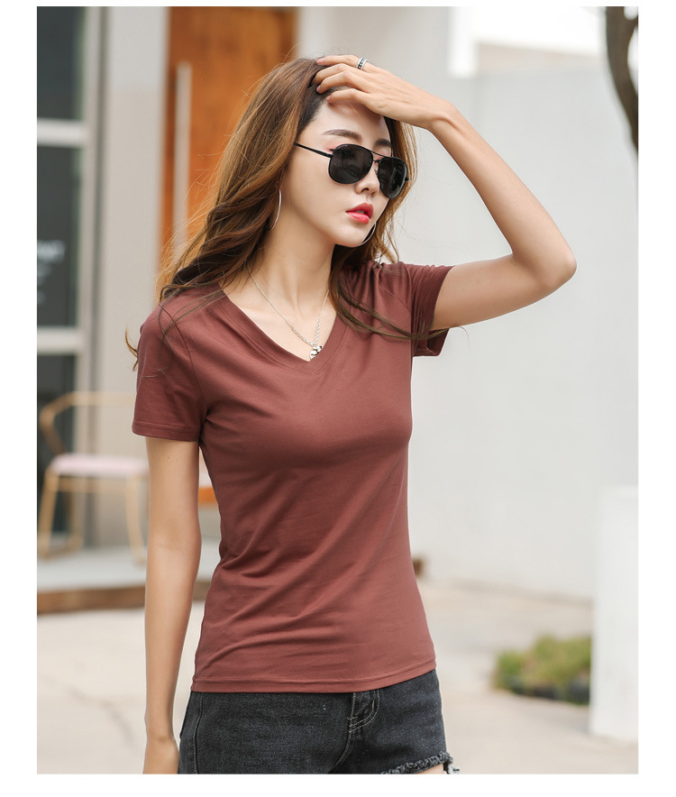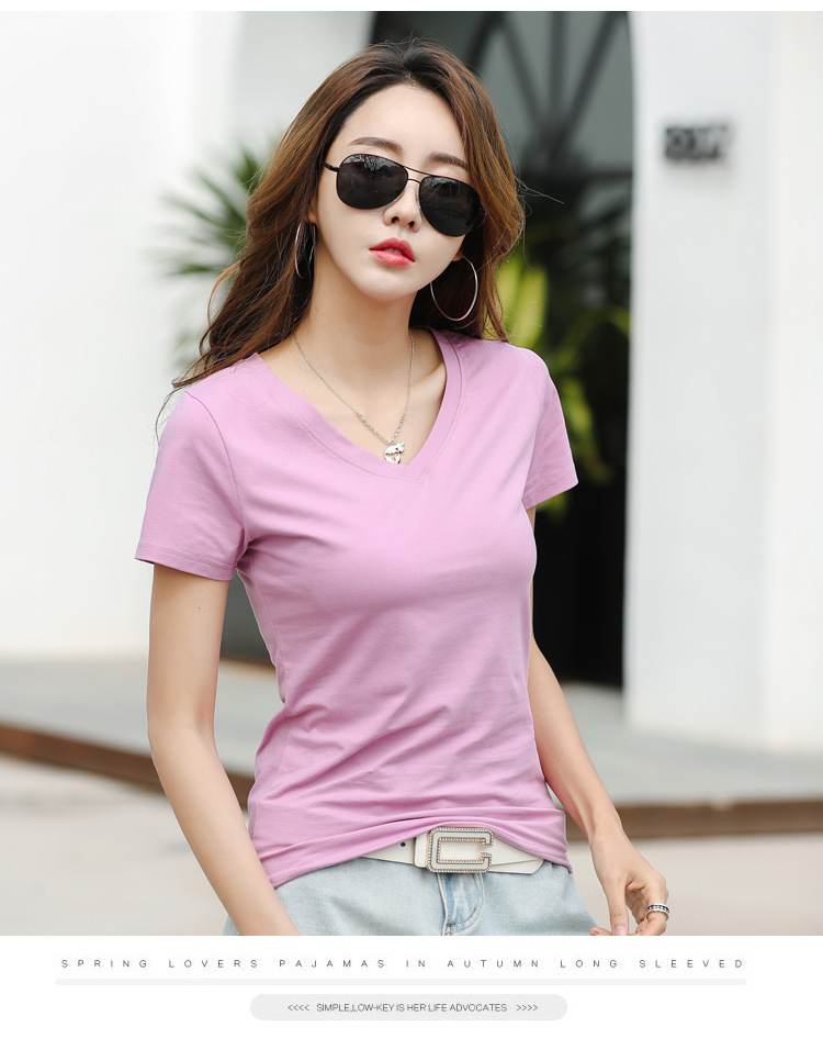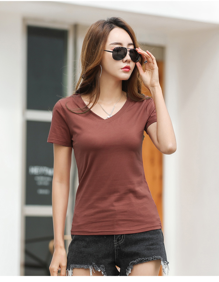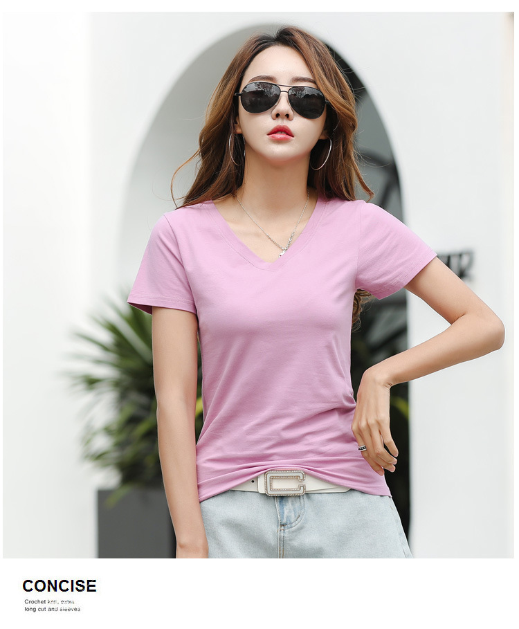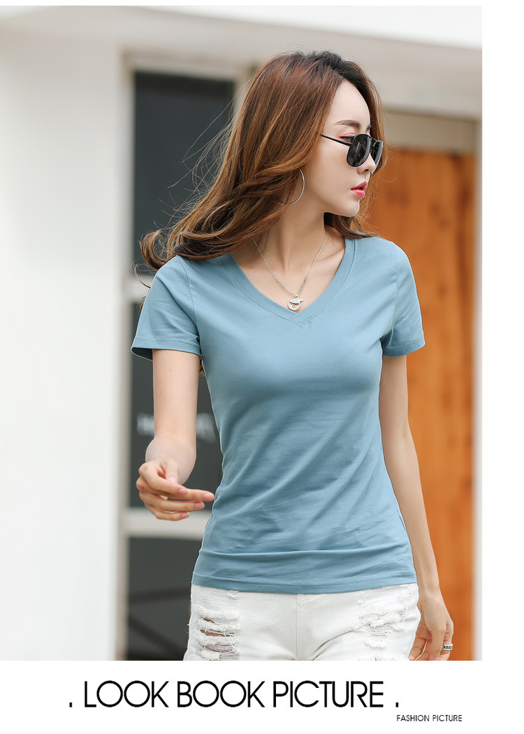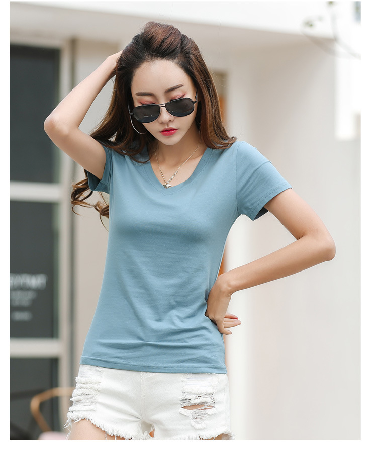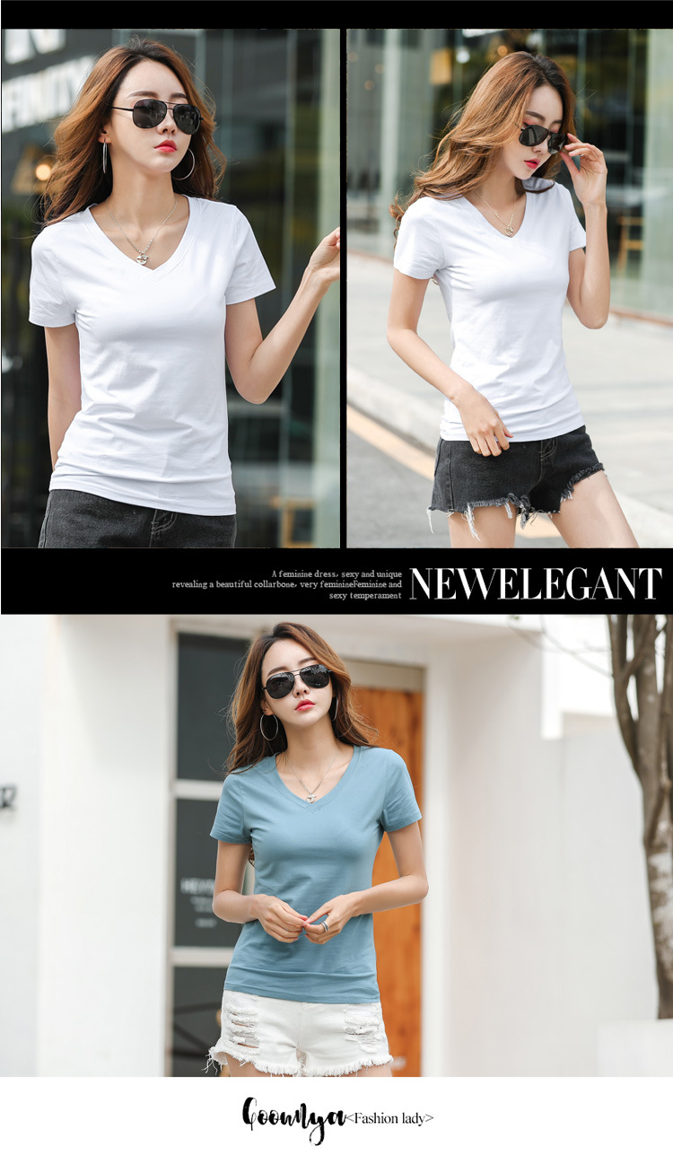 2025 여름 반팔 티셔츠 여성용 신상 면 슬림핏 한국 스타일 심플 단색 브이넥 이너웨어스토어 가기