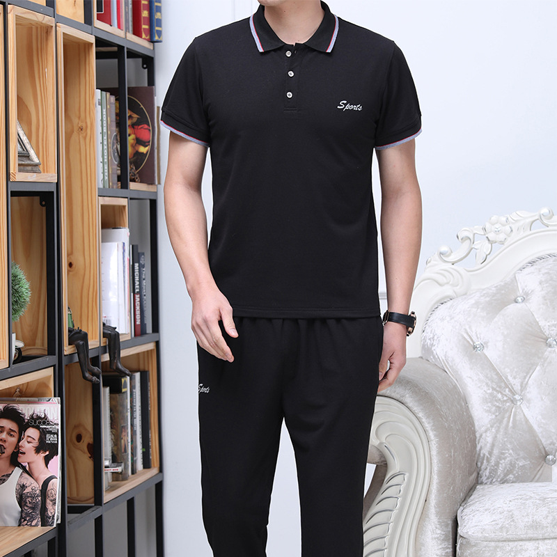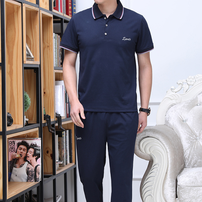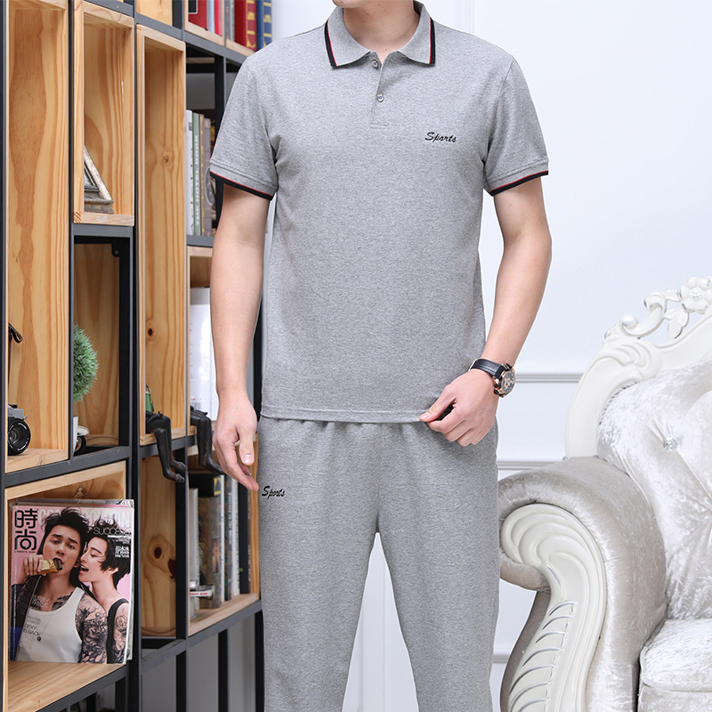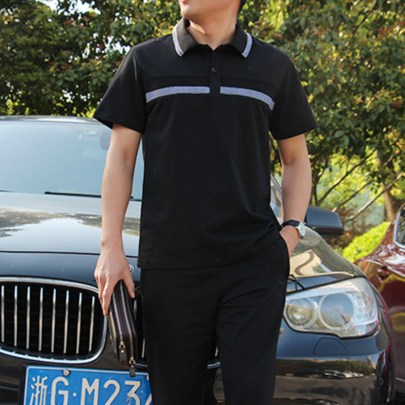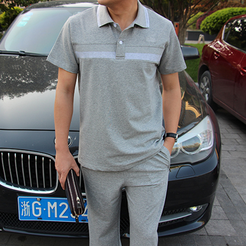 남성 여름 반팔 양복, 중노년 운동복, 남성 아빠 면 티셔츠, 캐주얼 라펠 투피스 세트스토어 가기