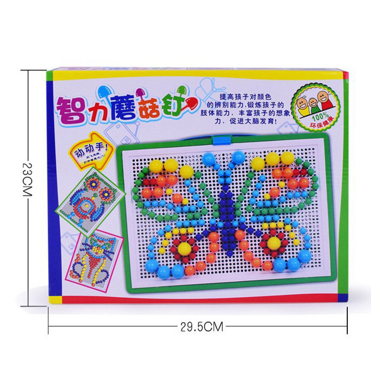 采用填充拼插,通过各种颜色的大小不同的蘑菇形颗粒,组成五彩斑斓的各种图案,变化多端,.既锻炼了宝宝的动手能力,又丰富了宝宝的想象力.还可教给宝宝识别各种颜色和简单的几何图形......对了,陪您的宝宝一起玩的话,那就更棒了,这是亲子游戏中很棒的一款哦!