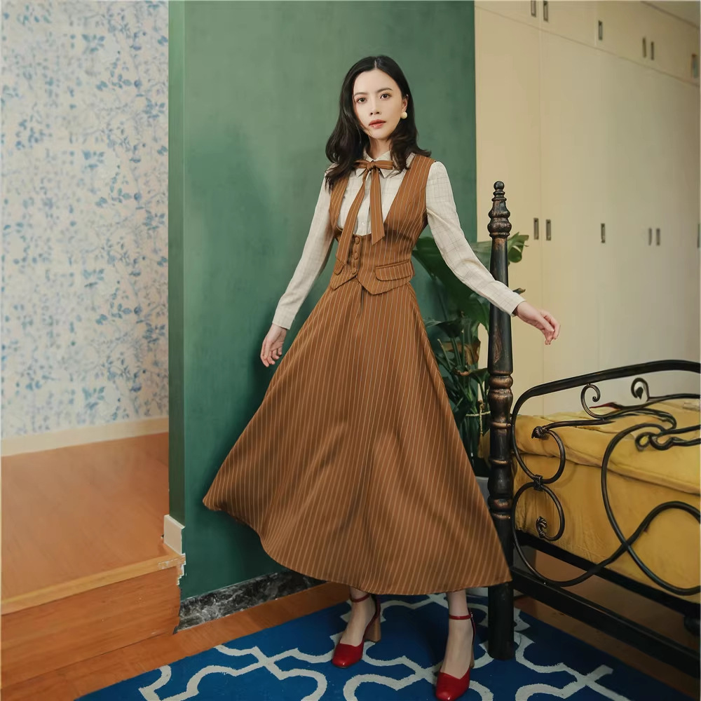 프랑스 영국 복고풍 로얄 시스터 세트 여성의 가을과 겨울 스트라이프 허리 조끼 셔츠 스커트 3 세트 원피스 봄 원피스