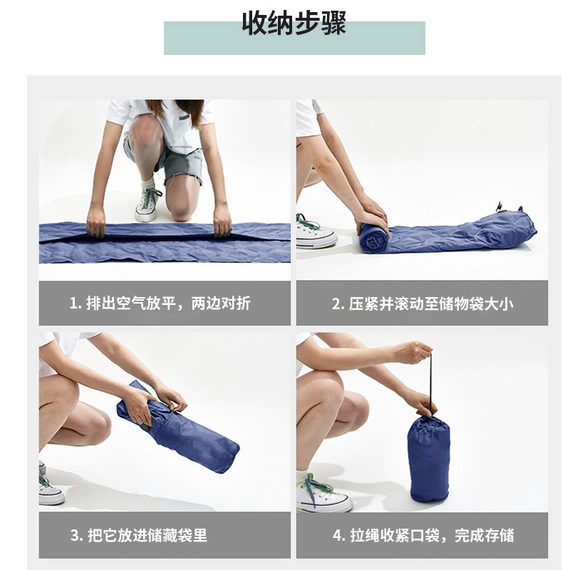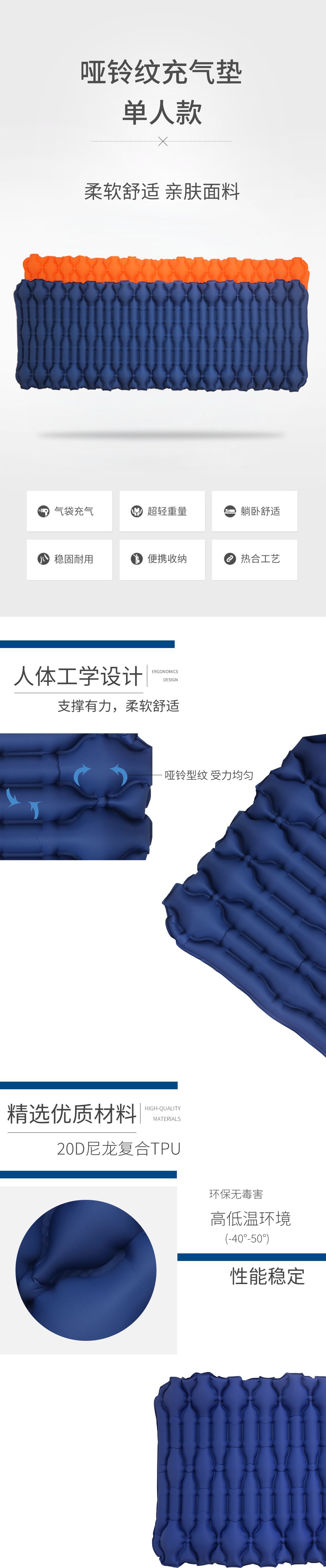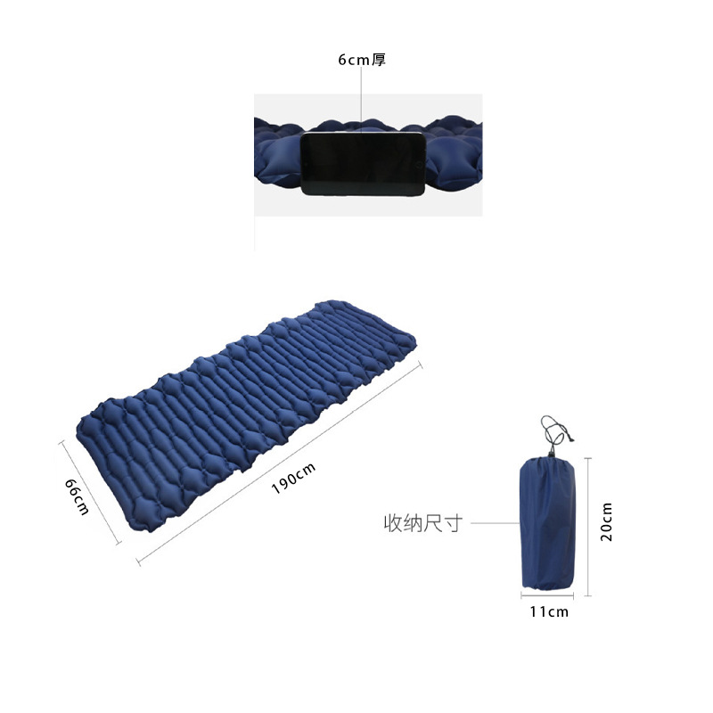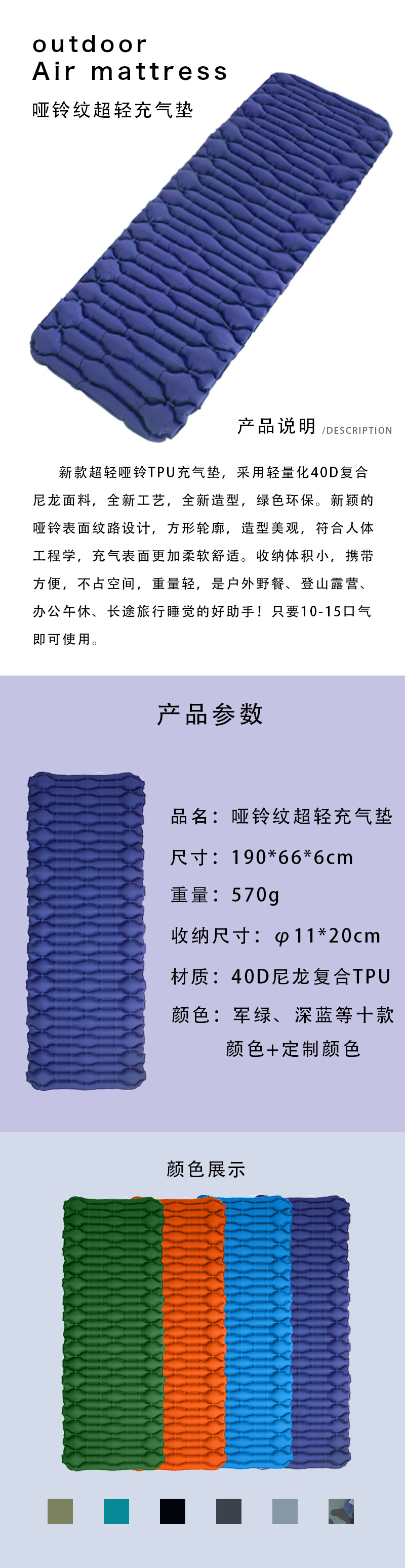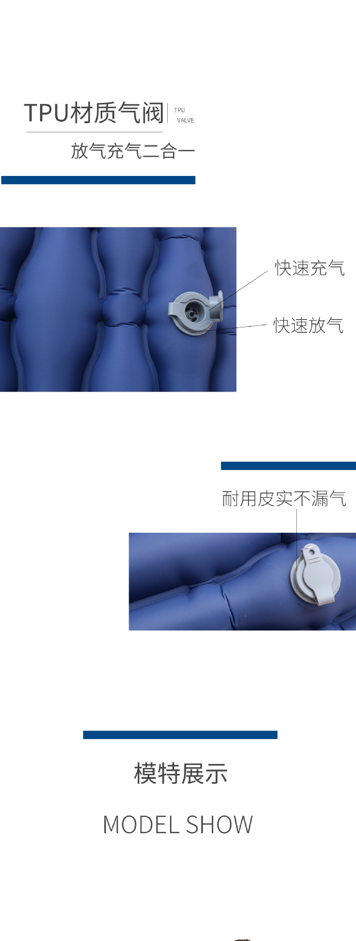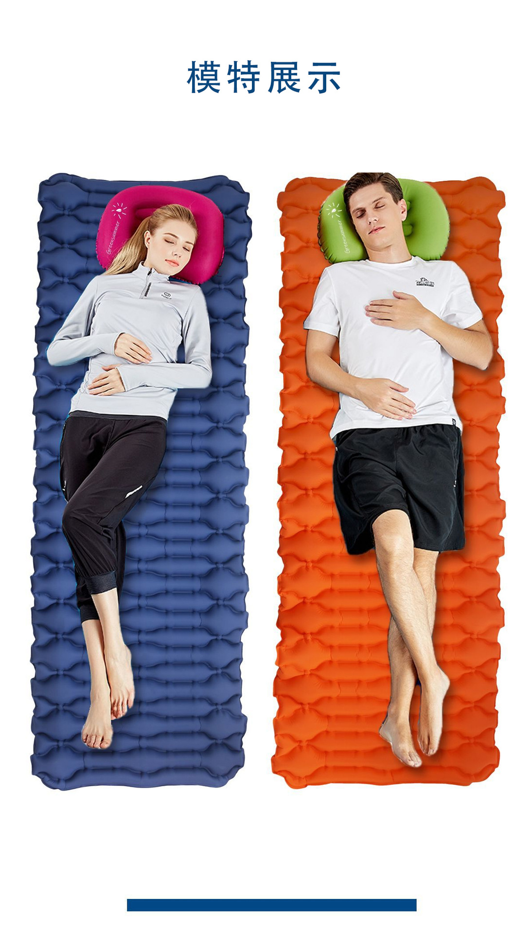 特点:充气舒适睡垫带枕头,枕头高度应用人体工程学,保护颈椎;面料透气,有弹性,且耐磨损、抗老化;快速吹气,只要10-15口气即可使用。