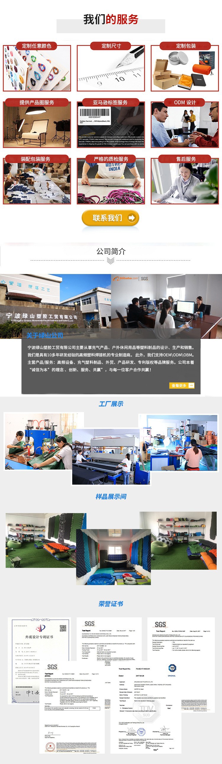 厂家直销,品质保障,定制化生产,支持产品、包装设计! 宁波绿山塑胶工贸有限公司专注于以充气产品为主的塑胶产品、户外休闲产品的设计、生产和销售。