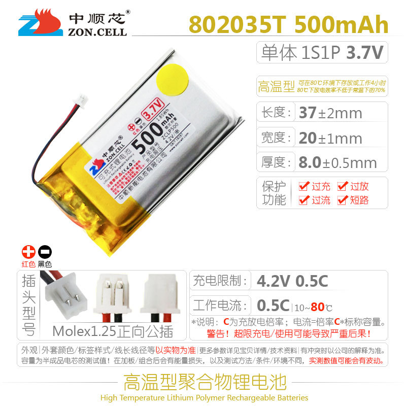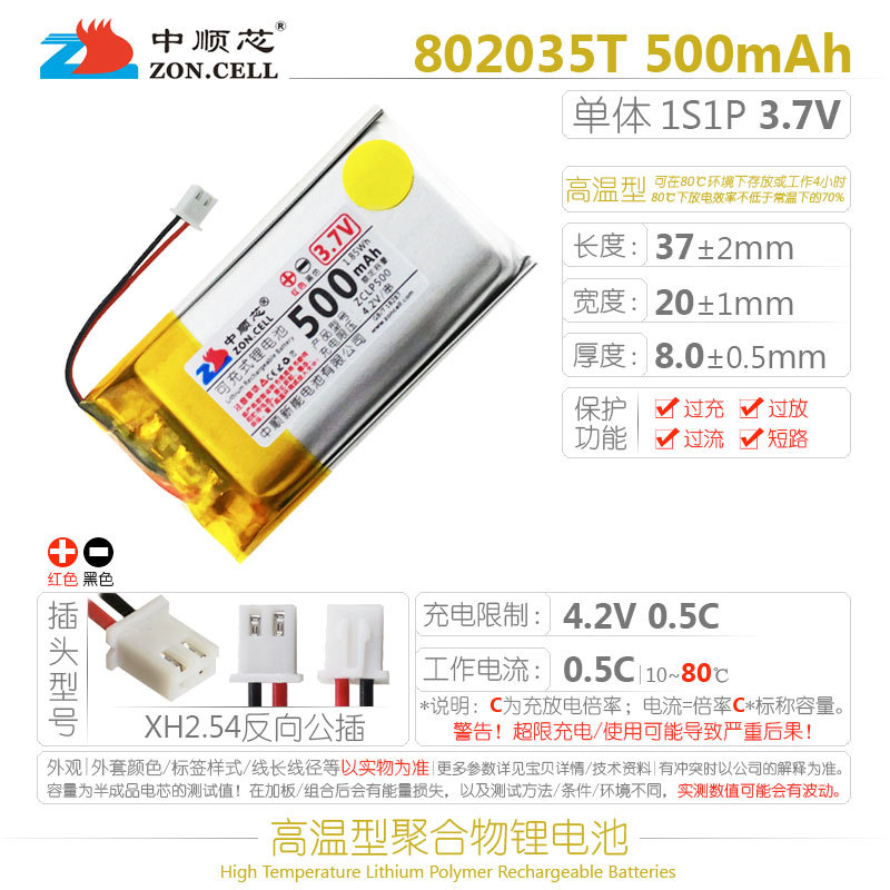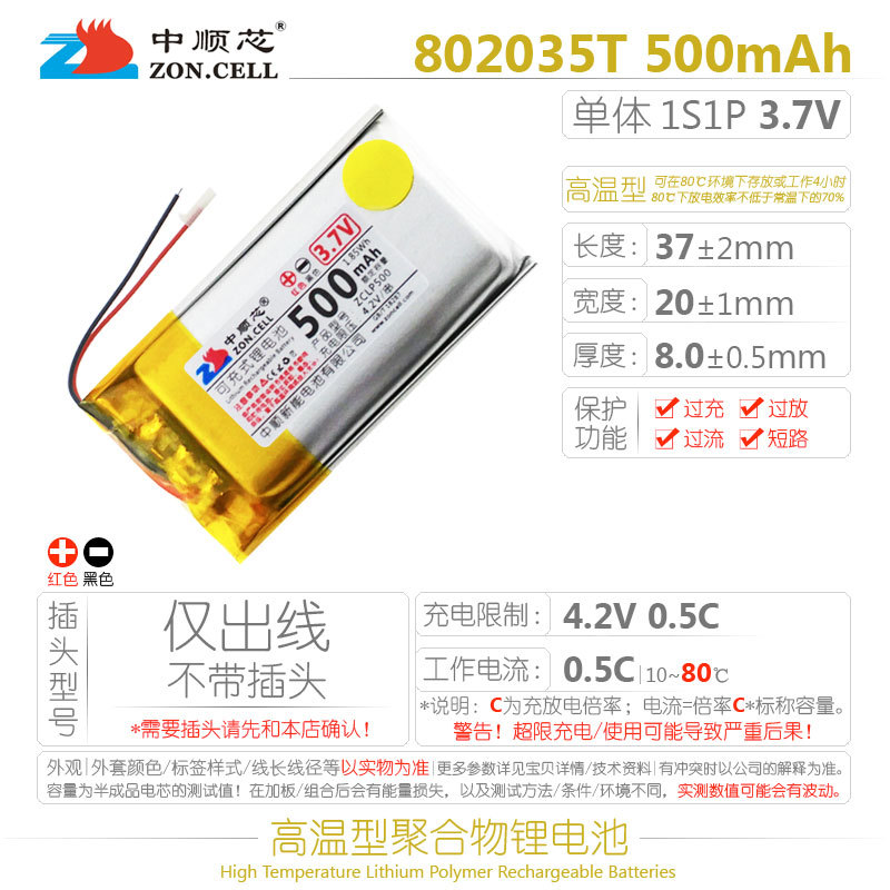 중순신802035 차량용 타이어 공기압계 블루투스 스피커 마사지기 고온형 폴리머 리튬 배터리 3.7V