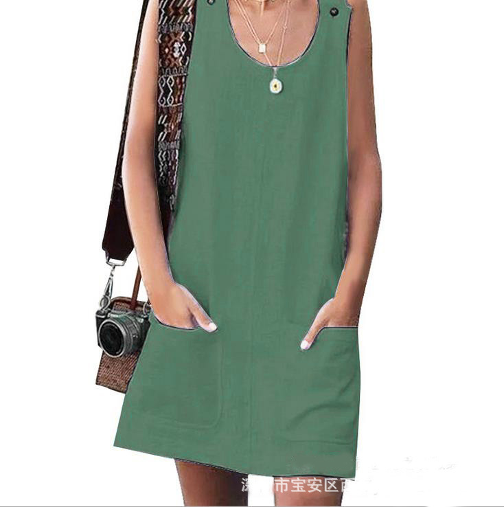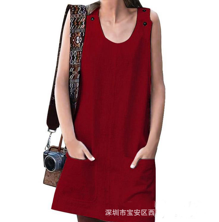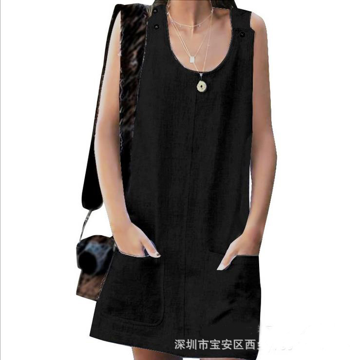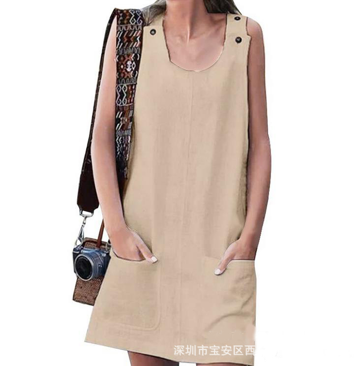 2019欧美跨境wish ebay夏季新款女装口袋纽扣棉麻背带连衣裙