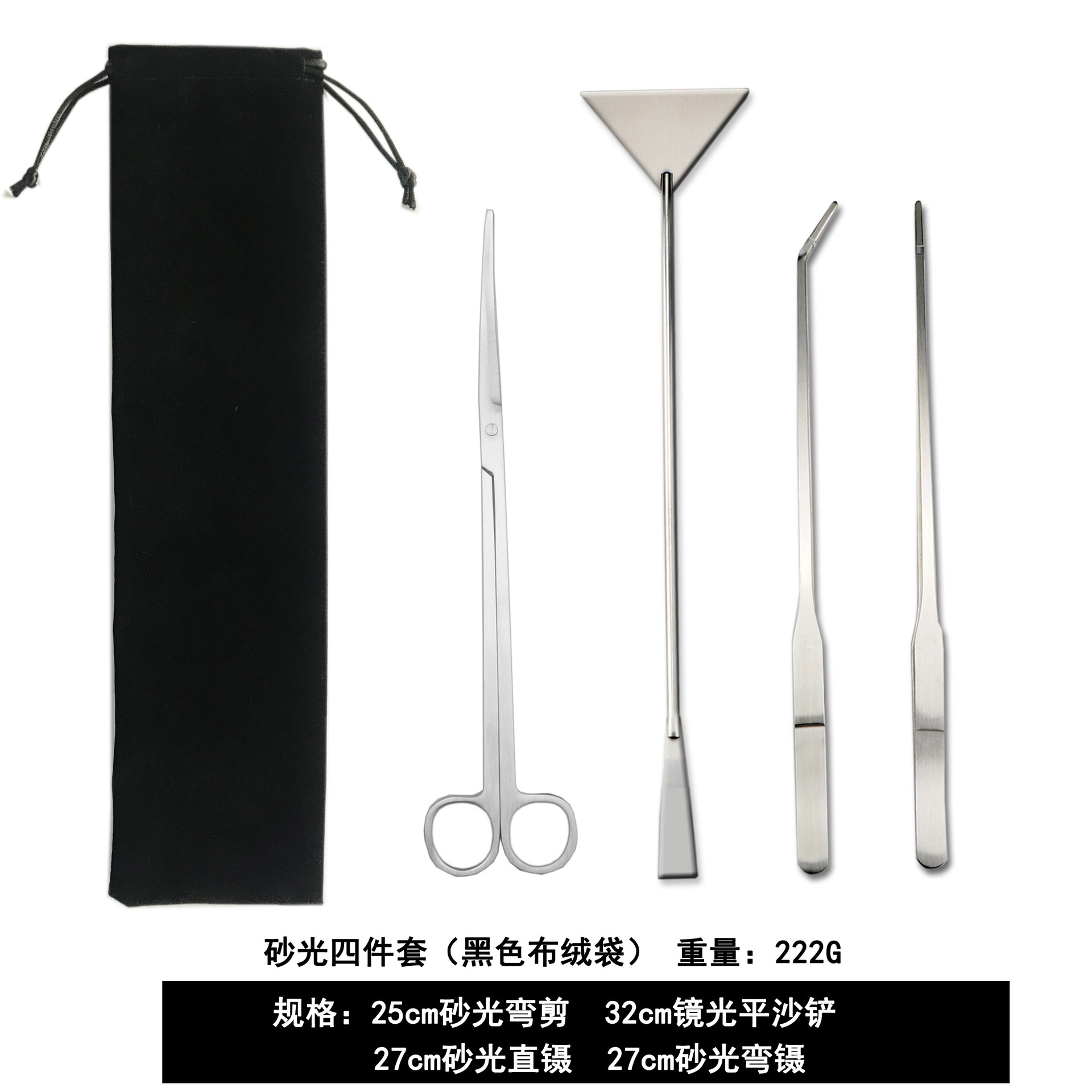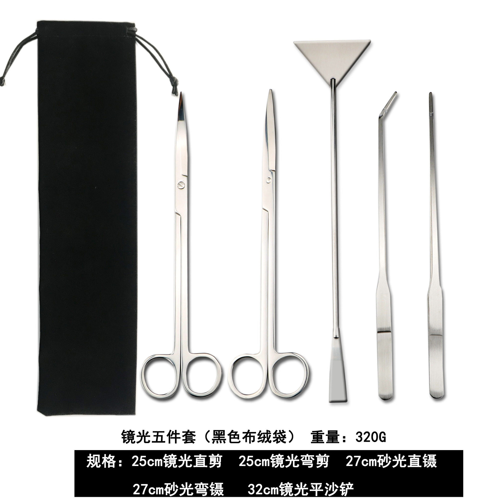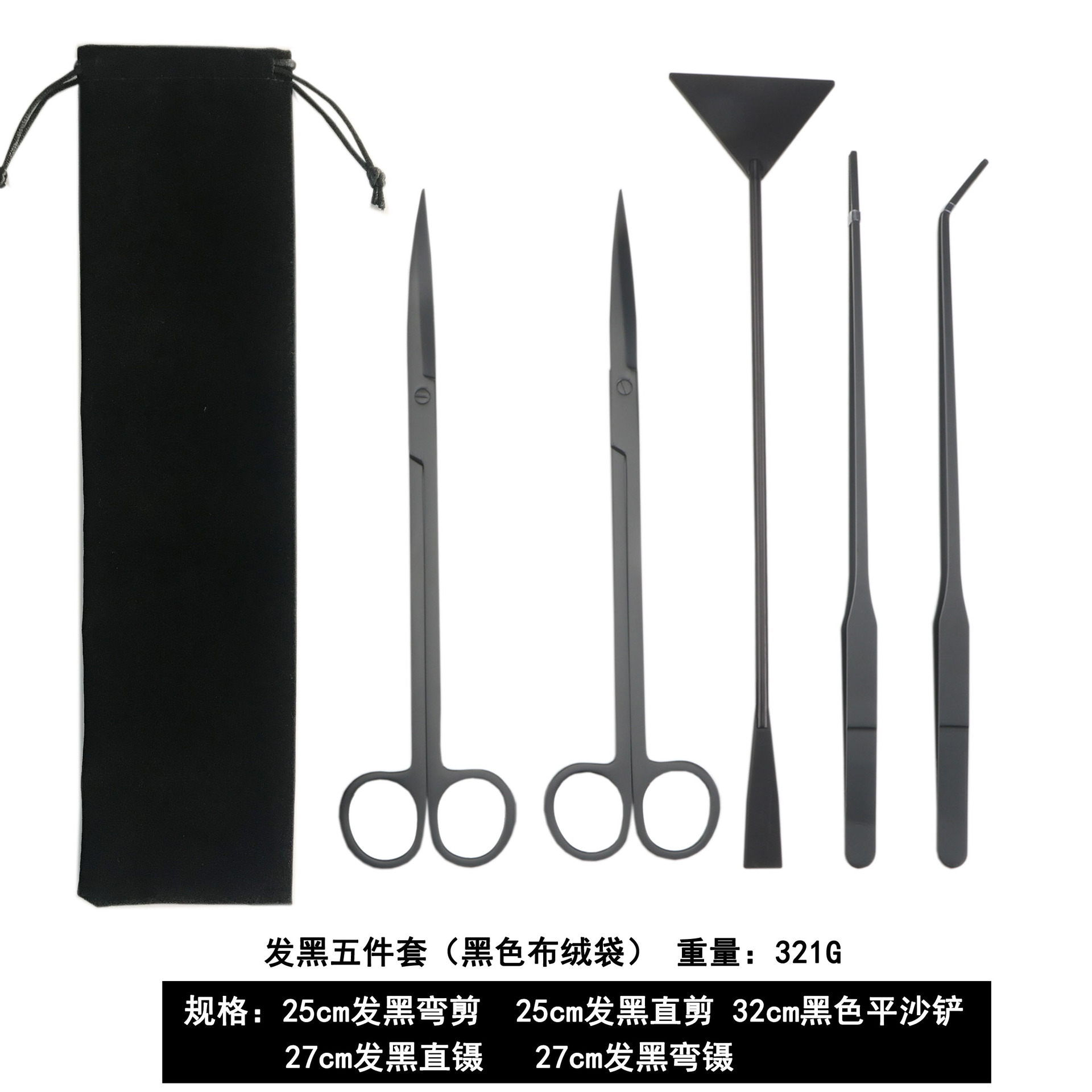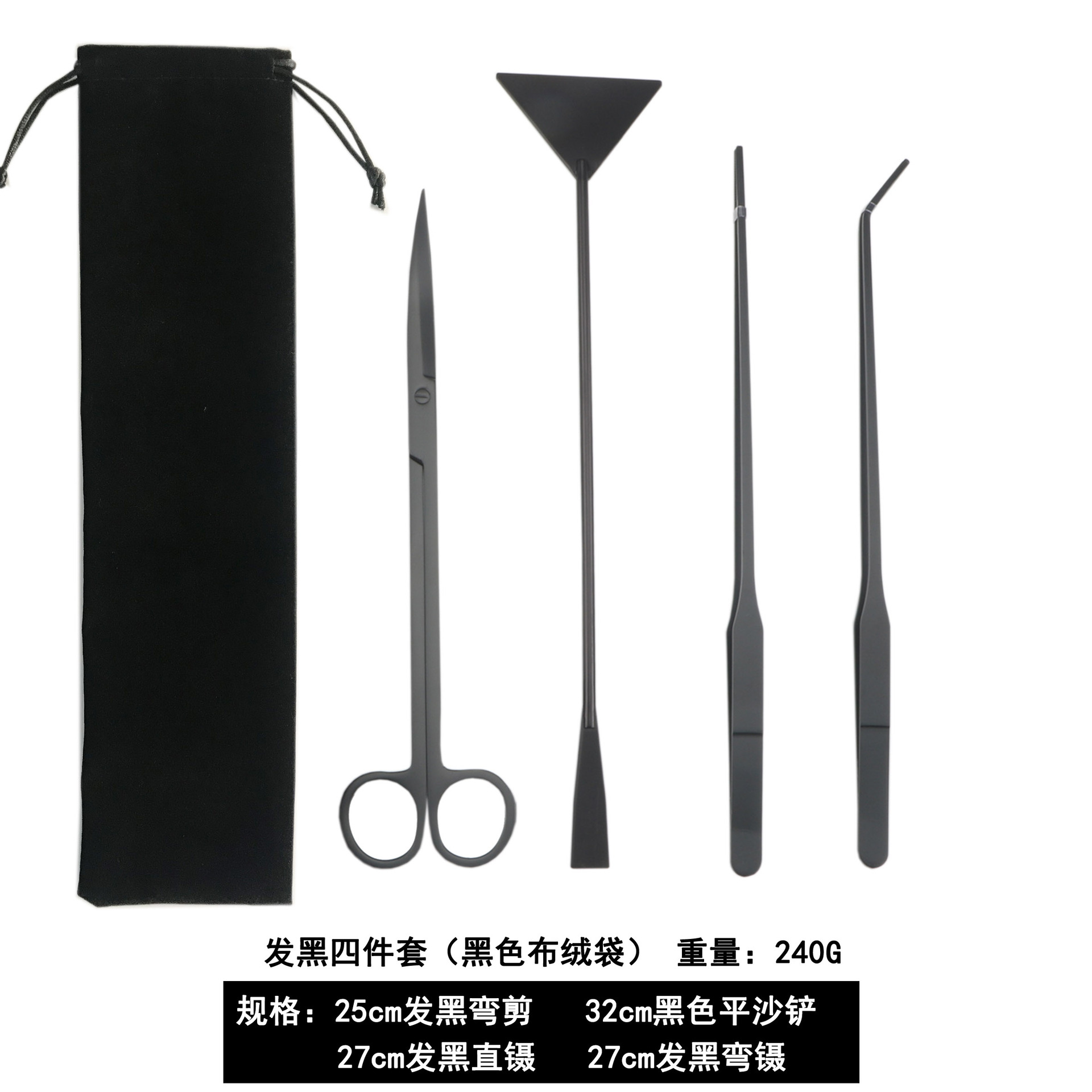 包含:25cm黑色弯剪 +27cm黑色直夹+27cm黑色弯夹+32cm黑色平沙铲 装布绒袋
