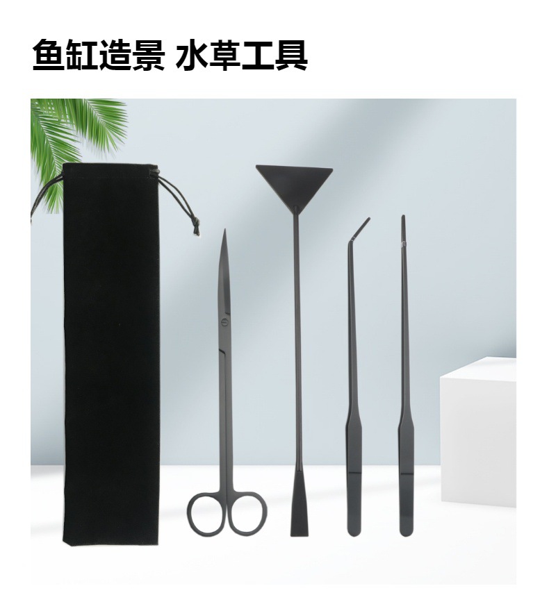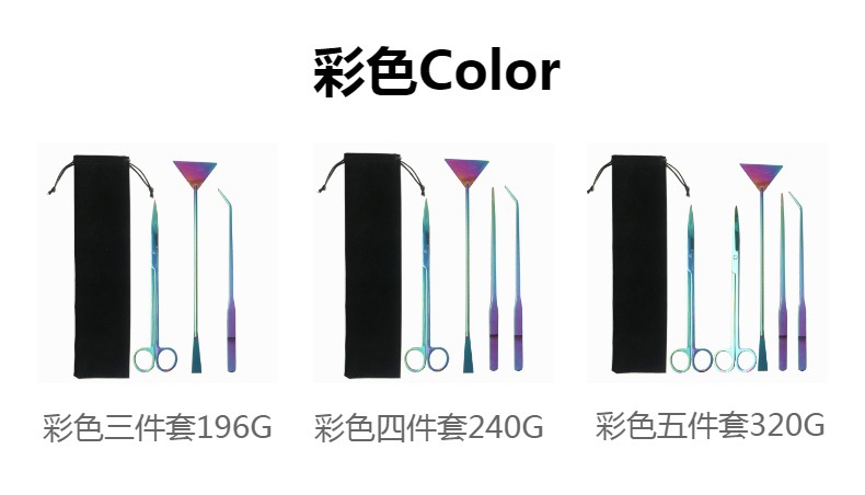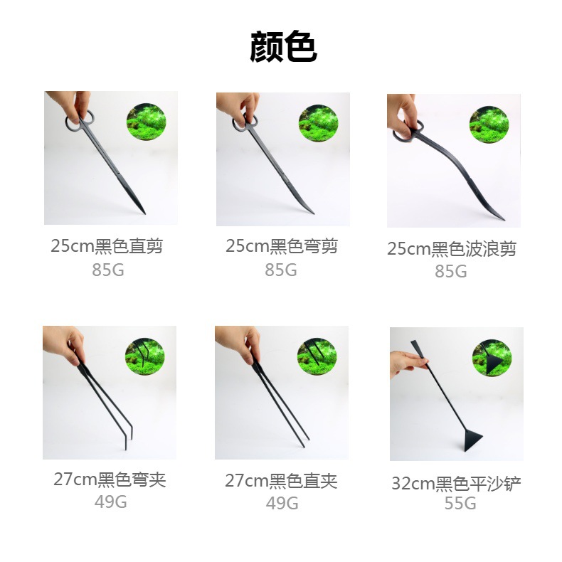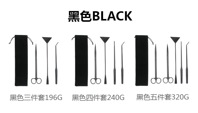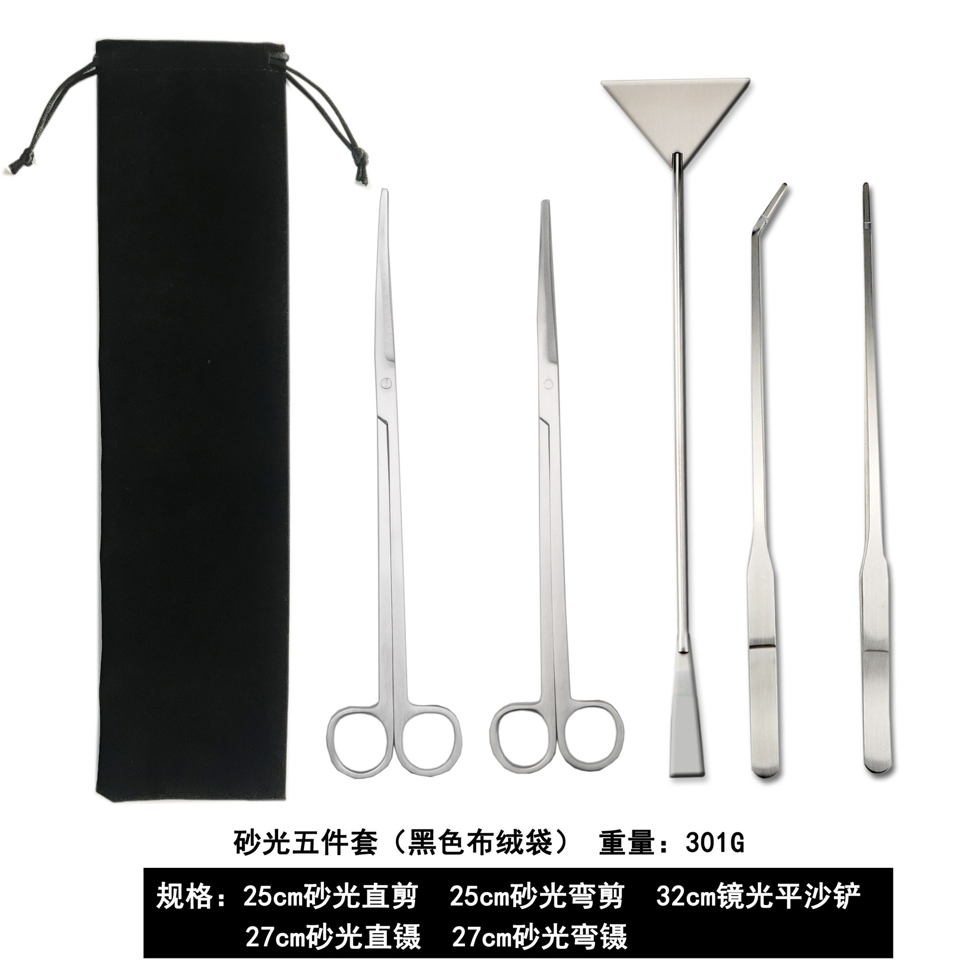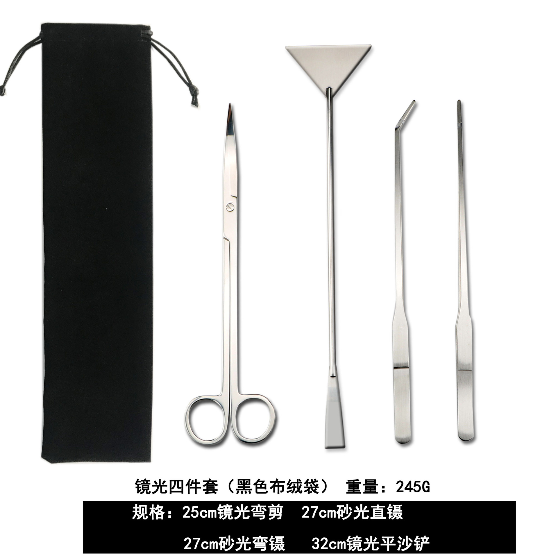 包含:25cm黑色弯剪 +27cm黑色直夹+27cm黑色弯夹+32cm黑色平沙铲 装布绒袋