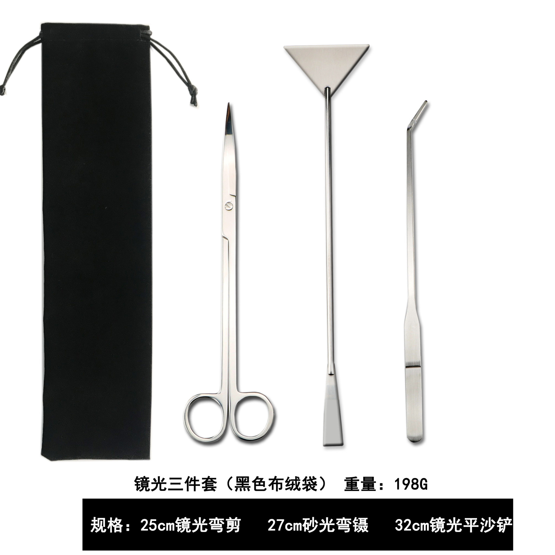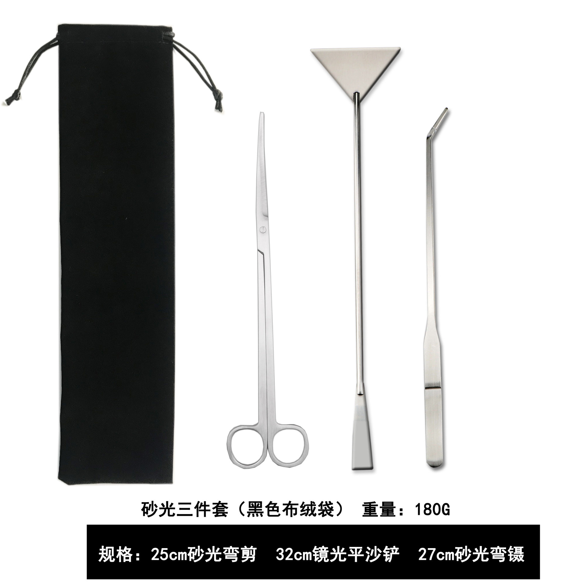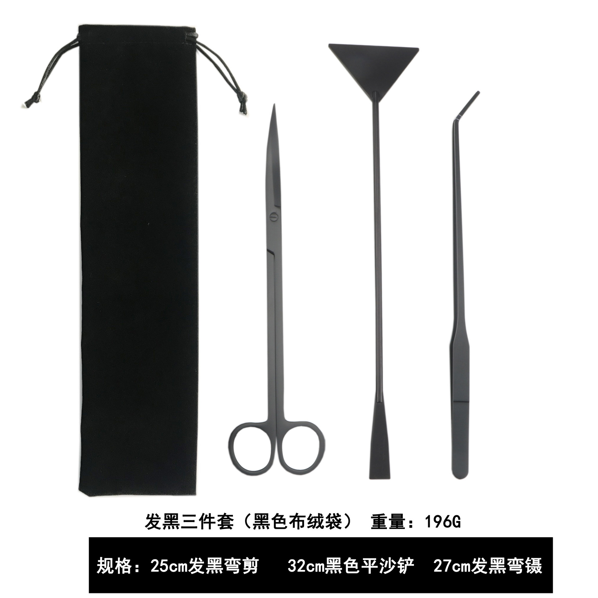 包含:25cm黑色弯剪 +27cm黑色弯夹+32cm黑色平沙铲 装布绒袋