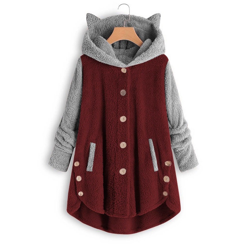 아마존 2025 가을 겨울 유럽 및 미국 스타일 버튼 후드 고양이 귀 플러시 탑 불규칙한 트렌디 브랜드 컬러 블록 여성용 재킷