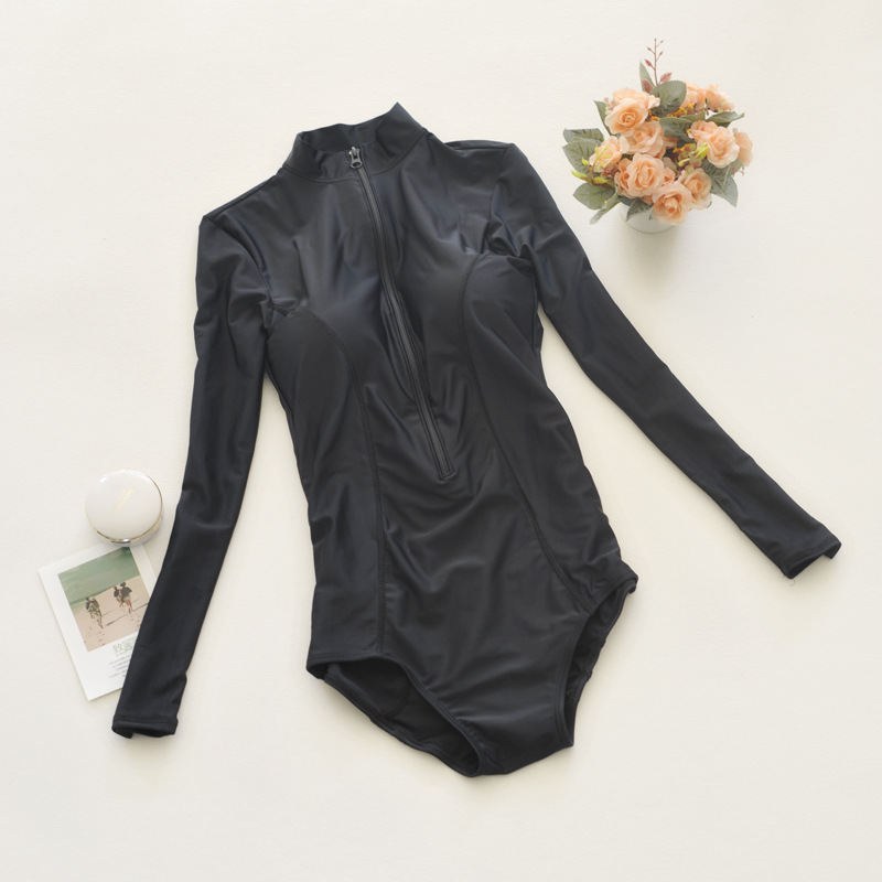 리얼샷 도매 크로스보더 AliExpress 한국 슬림 블랙 지퍼 긴 소매 삼각형 원피스 수영복 다이빙 세트
