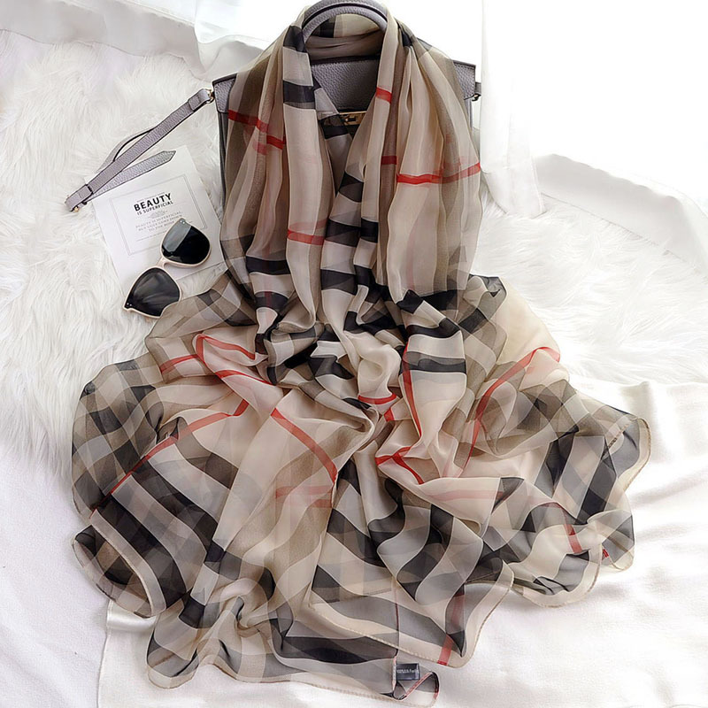 실크 스카프 영국 격자 무늬 실크 스카프 여성의 얇은 봄과 가을 얇은 스카프 Babag 자외선 차단제 장식 실크 스카프