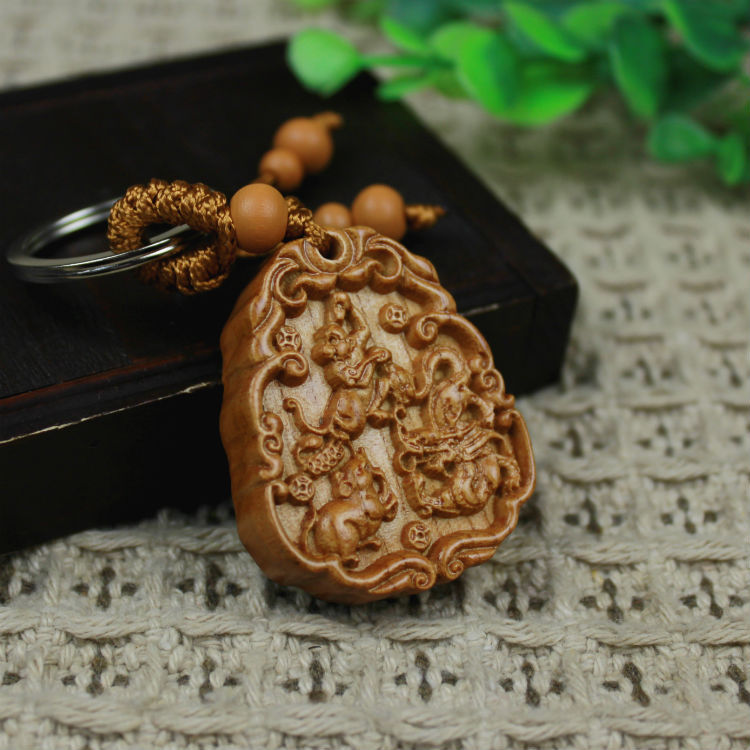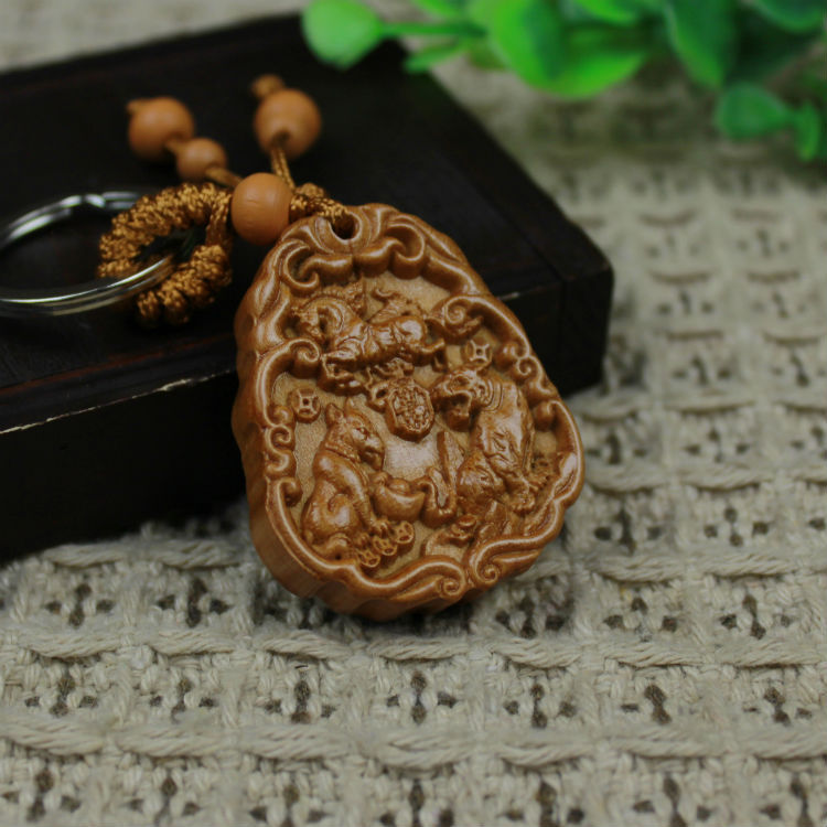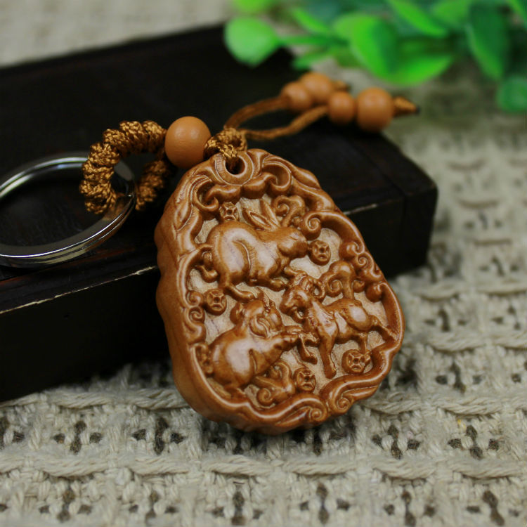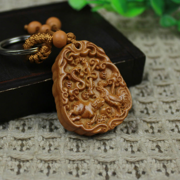 복숭아나무 조각 삼합간지 열쇠고리 목재 조각 열두간지 제조업체 도매 로고 각인 가능