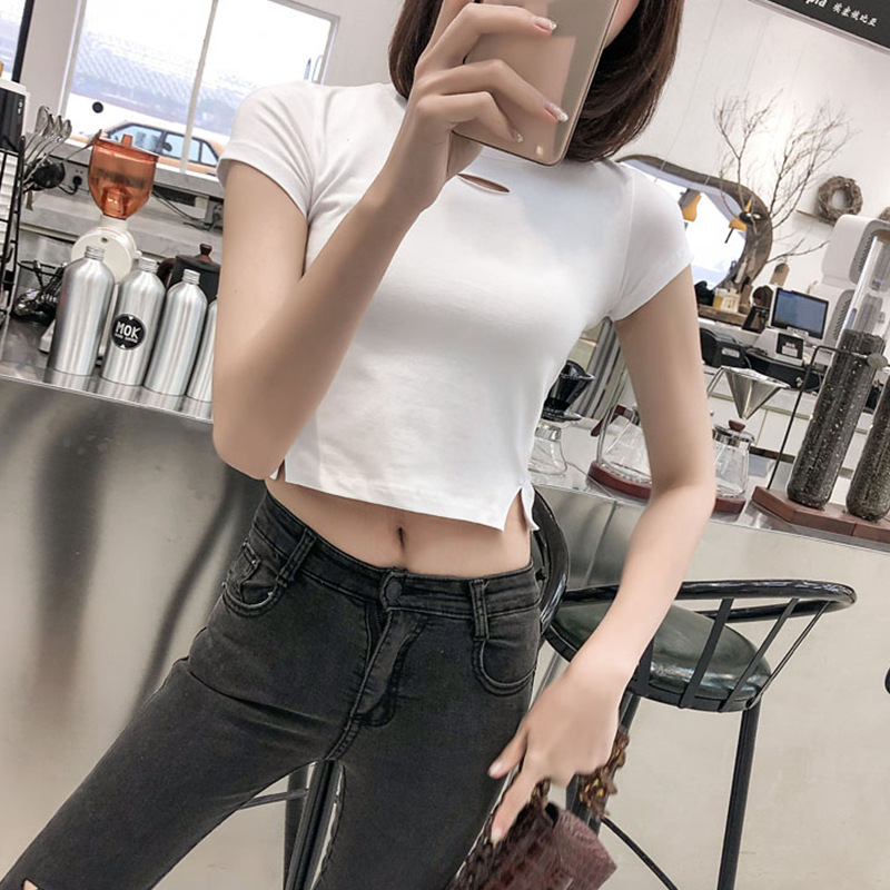 2022 여름 새로운 여성용 베이스 셔츠 슬림 한국 스타일 슬림핏 라운드 넥 하이 웨이스트 티셔츠 중공 면 탑 059스토어 가기