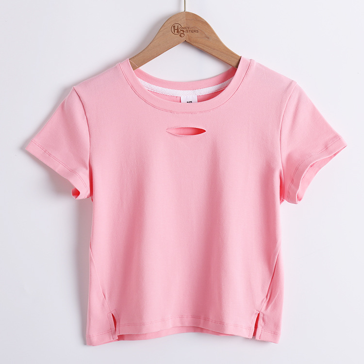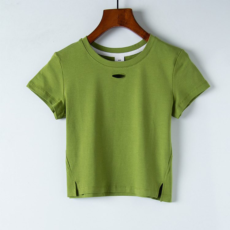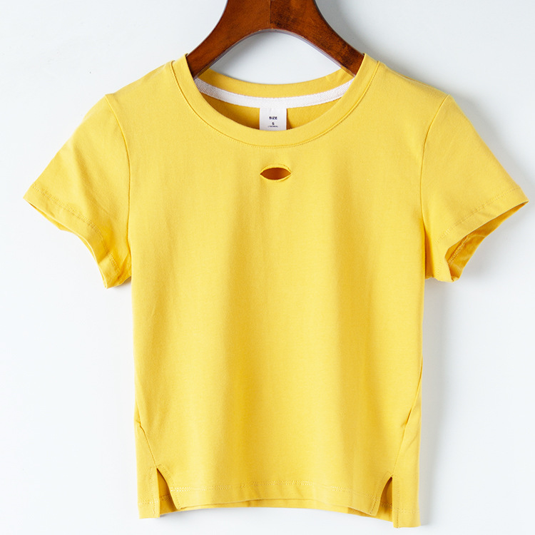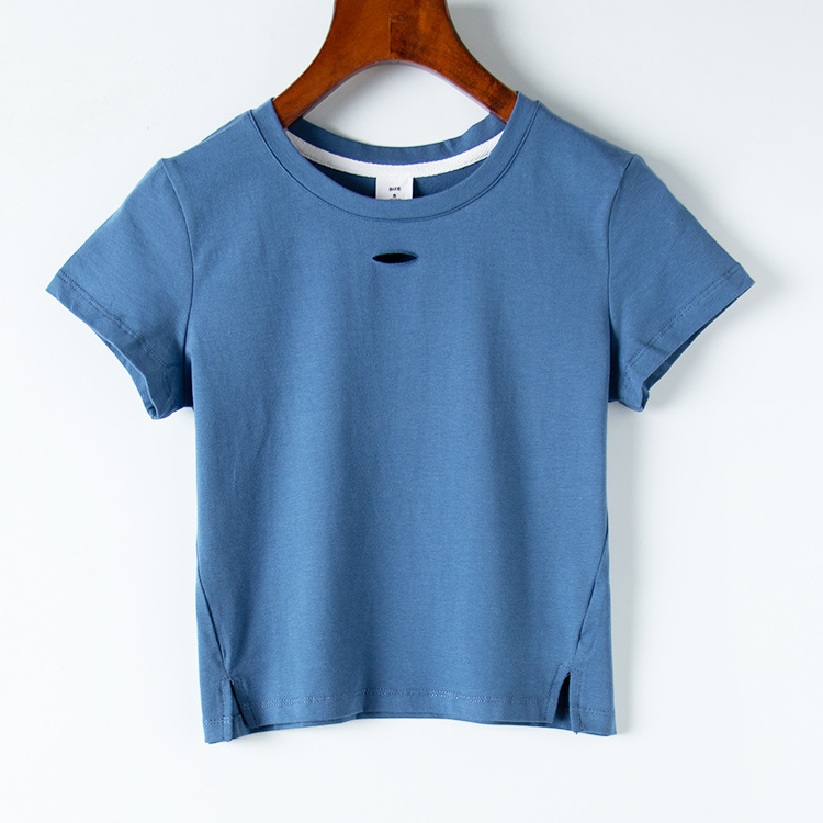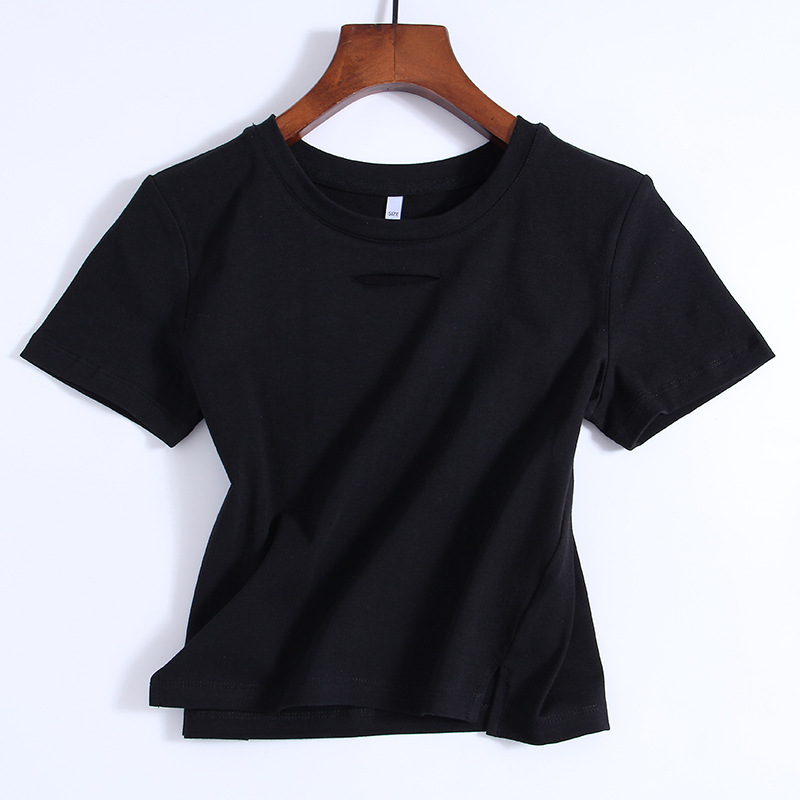 2022 여름 새로운 여성용 베이스 셔츠 슬림 한국 스타일 슬림핏 라운드 넥 하이 웨이스트 티셔츠 중공 면 탑 059