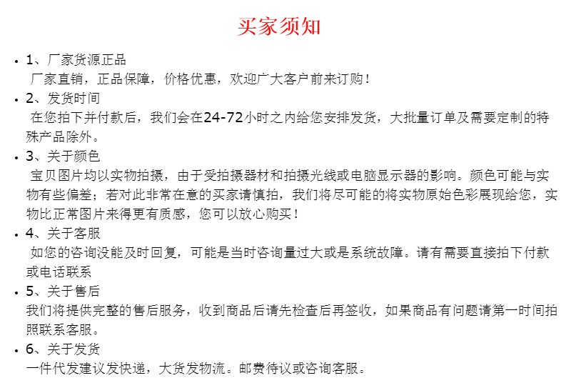 本店铺非无理由退换店铺,原则上产品售出,不接受非质量原因产生的退换货。请亲拍货之前慎重考虑,不要到时引起不必要的交易问题。