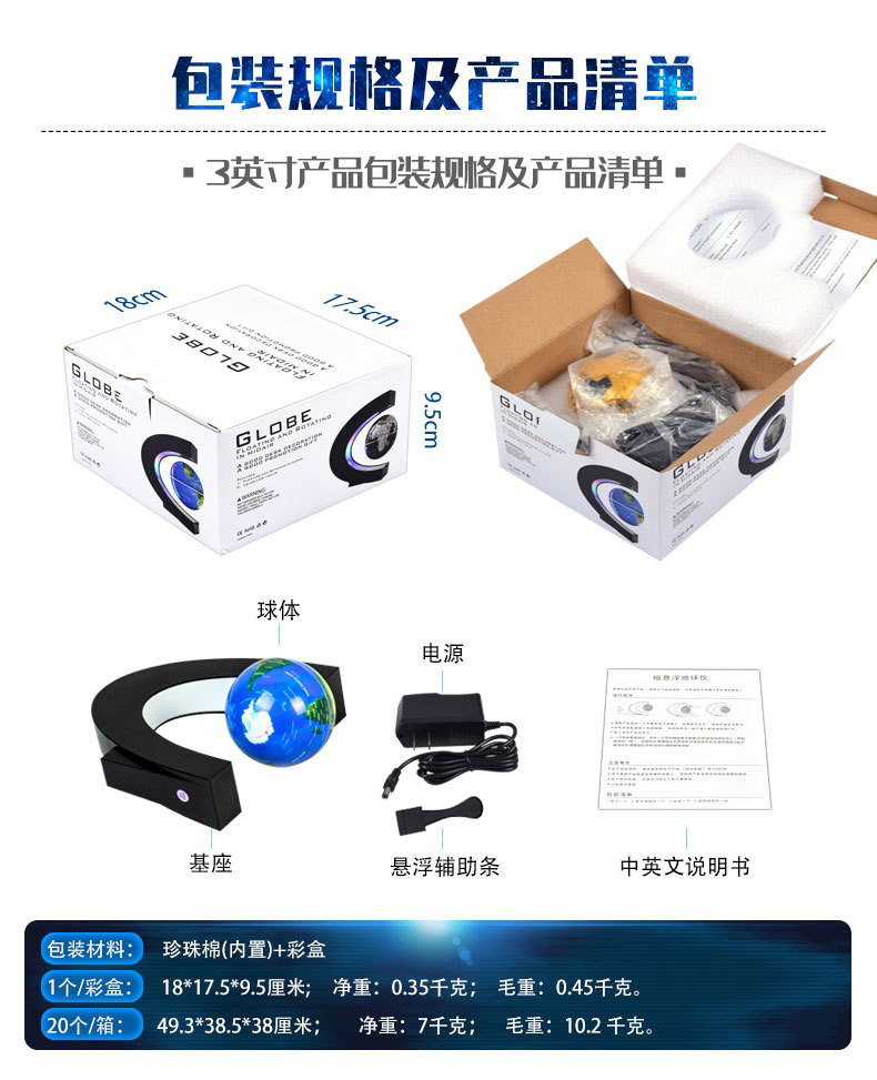 配件情况:球体、框架、电源适配器、辅助工具(条)、珍珠棉内衬、彩盒、中英文说明书