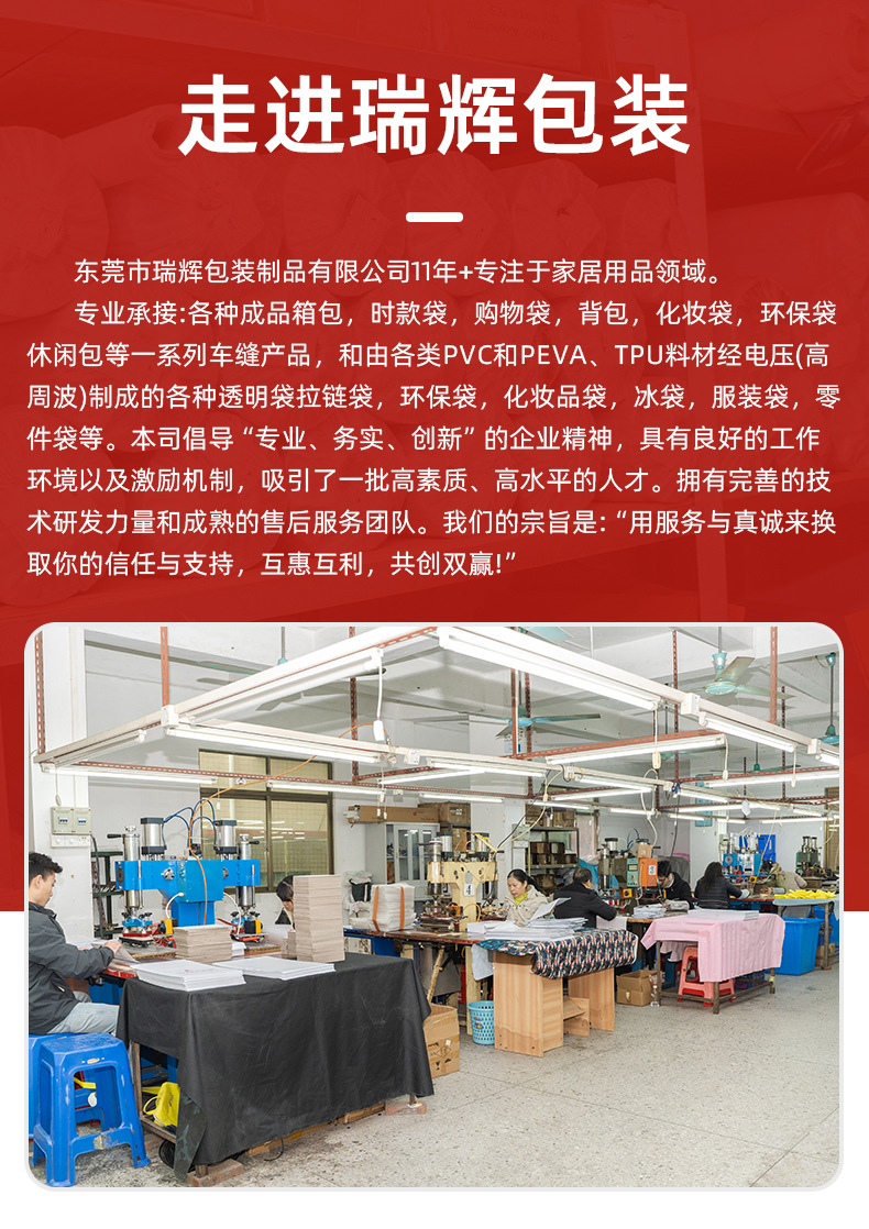 东莞市瑞辉包装专注箱包定制20年 厂房4000平方米 10条生产线 50人团队 年产量100万件 支持OEM ODM定制 来样加工 贴牌加工 现货批发 一件代发 产品远销国内外