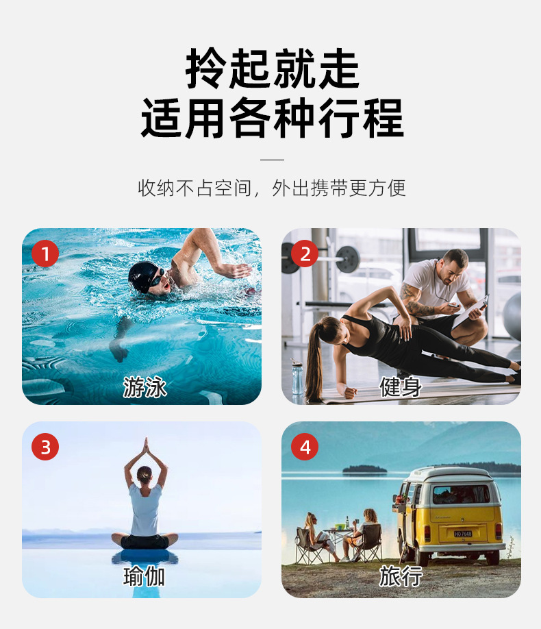 干湿分离设计 科学分区 湿区采用EVA防水材质 游泳后的湿泳衣毛巾与干衣物电子产品互不干扰 干区存放手机钱包换洗衣物 保持干爽洁净 防泼水面料 采用高密度牛津布或EVA环保材质 表面防泼水处理 有效防止雨水渗透 雨天沙滩泳池边使用无忧 面料耐磨抗污易清洁 大容量储存 多款尺寸可选 容量20至40升 可容纳泳衣毛巾洗漱用品换洗衣物拖鞋等全套装备 满足1至3天短途旅行需求 舒适手提加双肩背带 加宽加固提手承重力好不勒手 部分型号配备可调节双肩背带 手提背负两用 解放双手折叠便携 可折叠收纳 压缩至小体积 节省存储空间 适合旅行箱收纳家中存放车后备箱备用