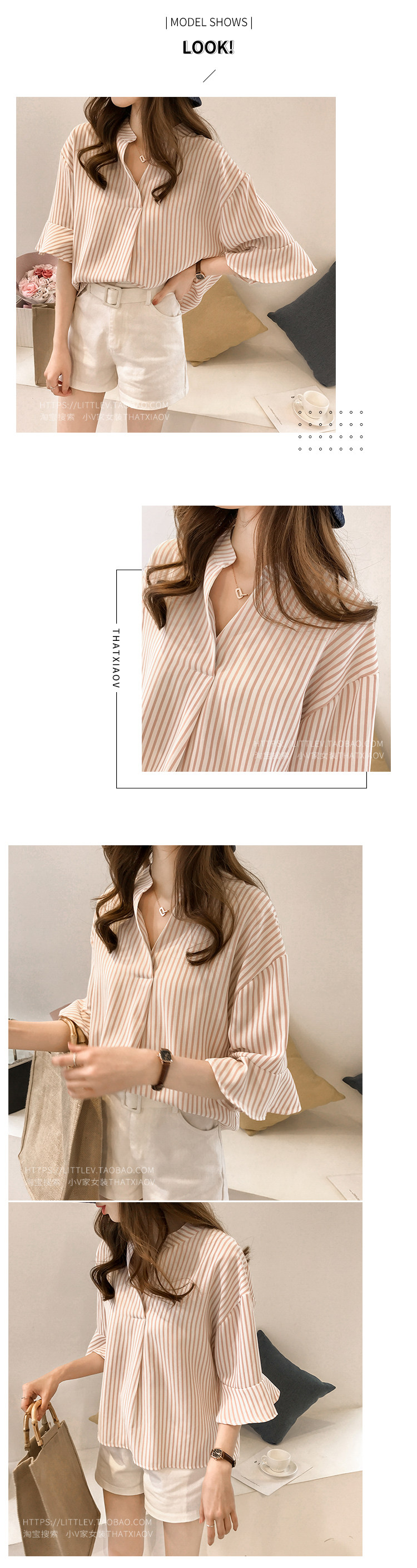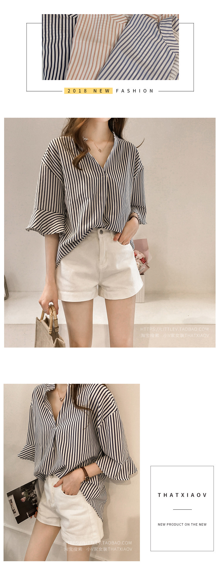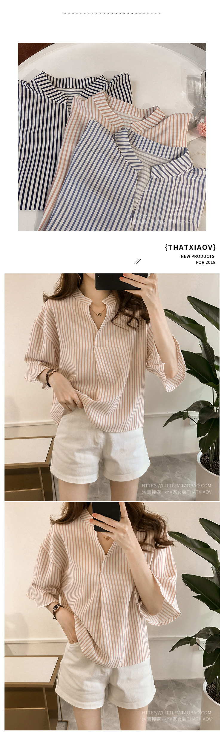 여름 여성 의류 새로운 한국 스타일 느슨한 V-넥 스트라이프 셔츠 여성 크롭 슬리브 탑 모든 매치 캐주얼 셔츠