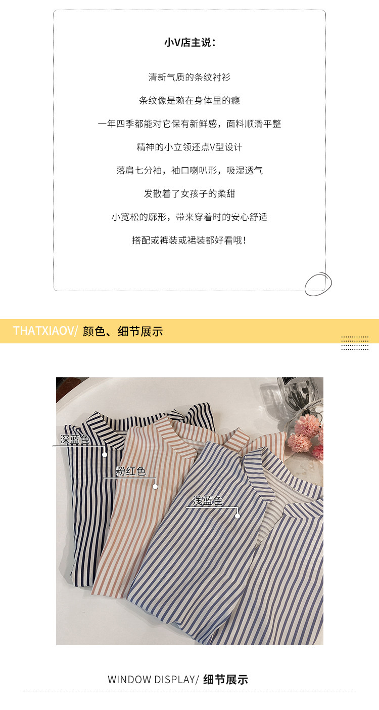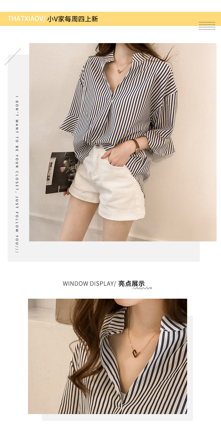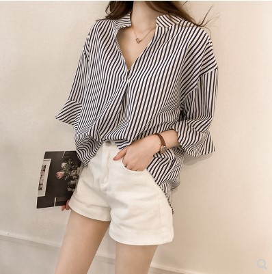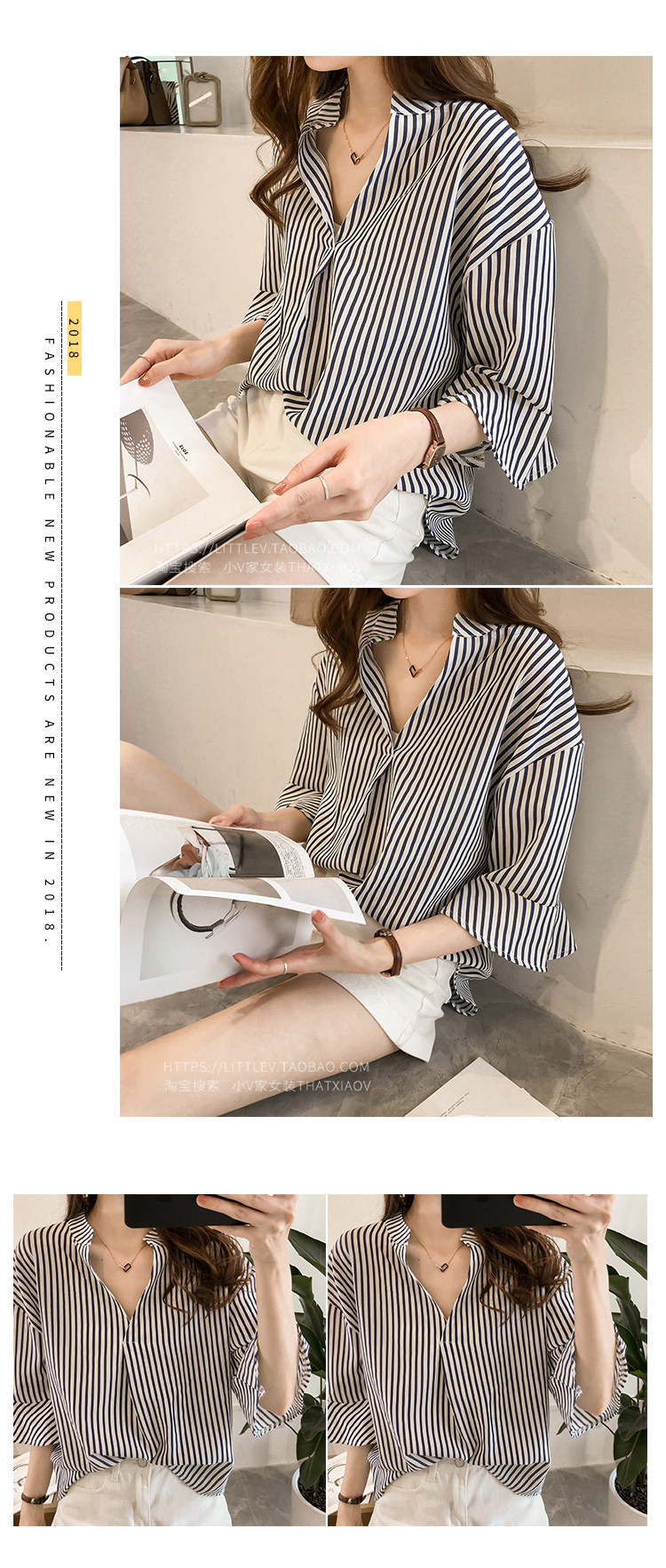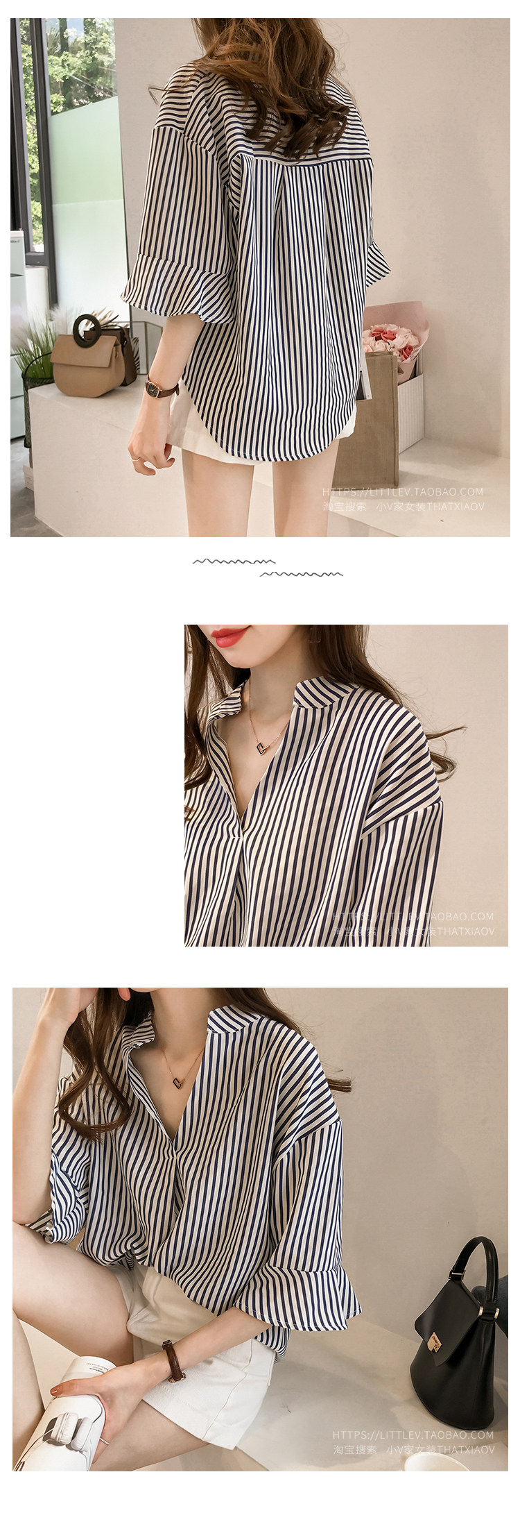 여름 여성 의류 새로운 한국 스타일 느슨한 V-넥 스트라이프 셔츠 여성 크롭 슬리브 탑 모든 매치 캐주얼 셔츠