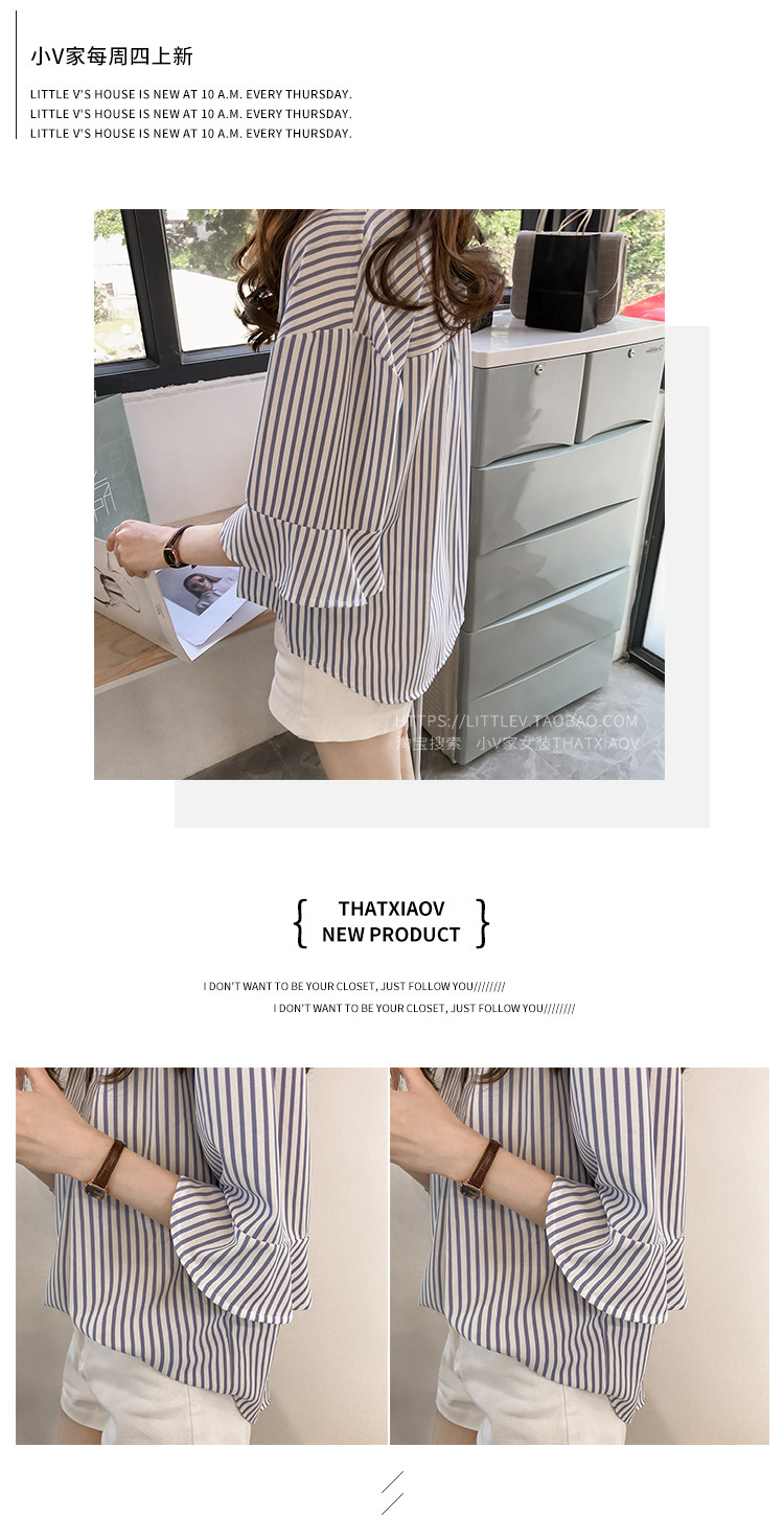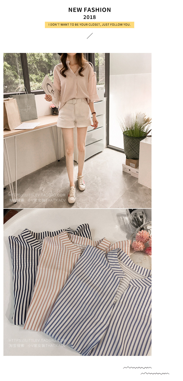 여름 여성 의류 새로운 한국 스타일 느슨한 V-넥 스트라이프 셔츠 여성 크롭 슬리브 탑 모든 매치 캐주얼 셔츠스토어 가기