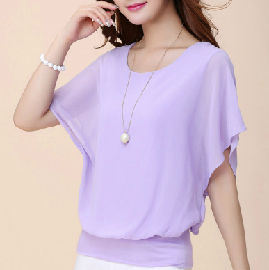 공장 직공급 여름 새로운 유럽과 미국 여성의 AliExpress 플러스 사이즈 여성의 단색 달콤한 반팔 티셔츠 쉬폰 셔츠 여성스토어 가기